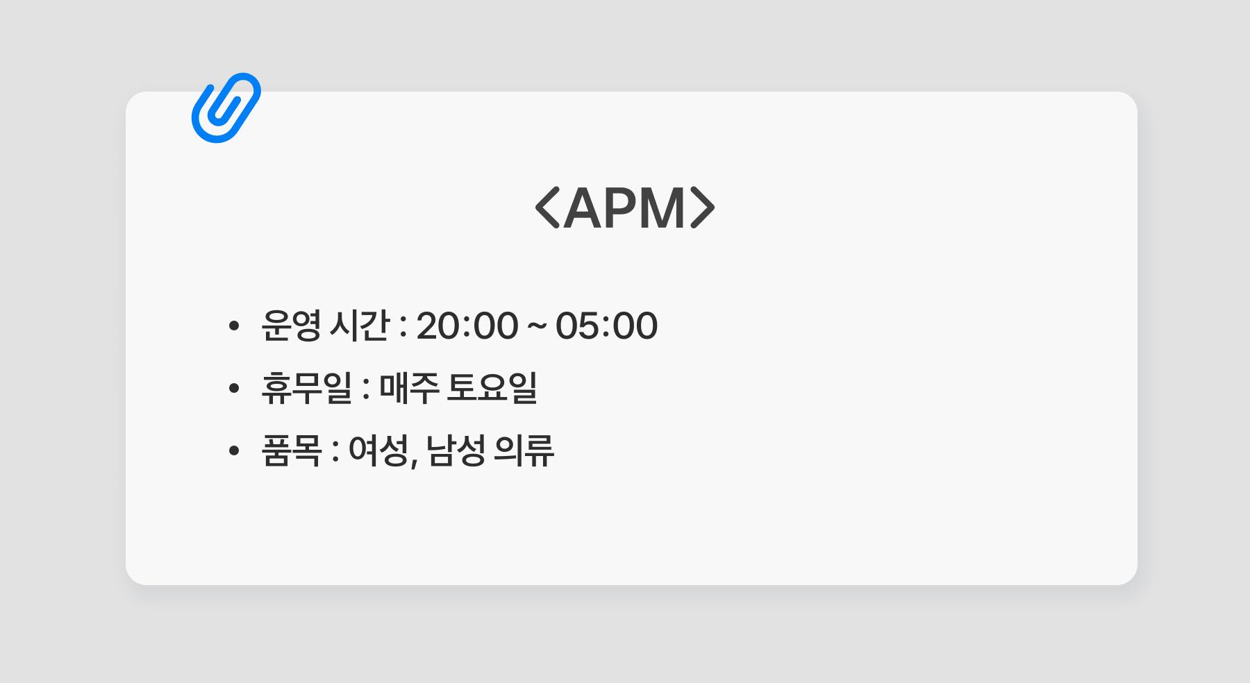 APM에서 운영하는 도매 시장은 세 군데가 있어요. 이곳 모두 낮 시장과 달리 제품 단가가 높은 편인데요. 그만큼 소재와 봉제 퀄리티가 좋아서 쇼핑몰 사장님이 많이 찾는 시장 중 하나예요.