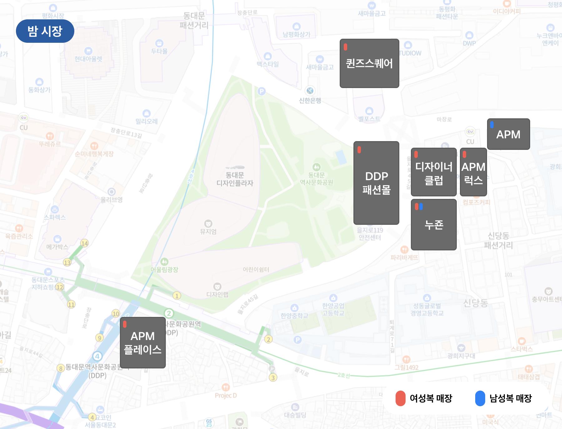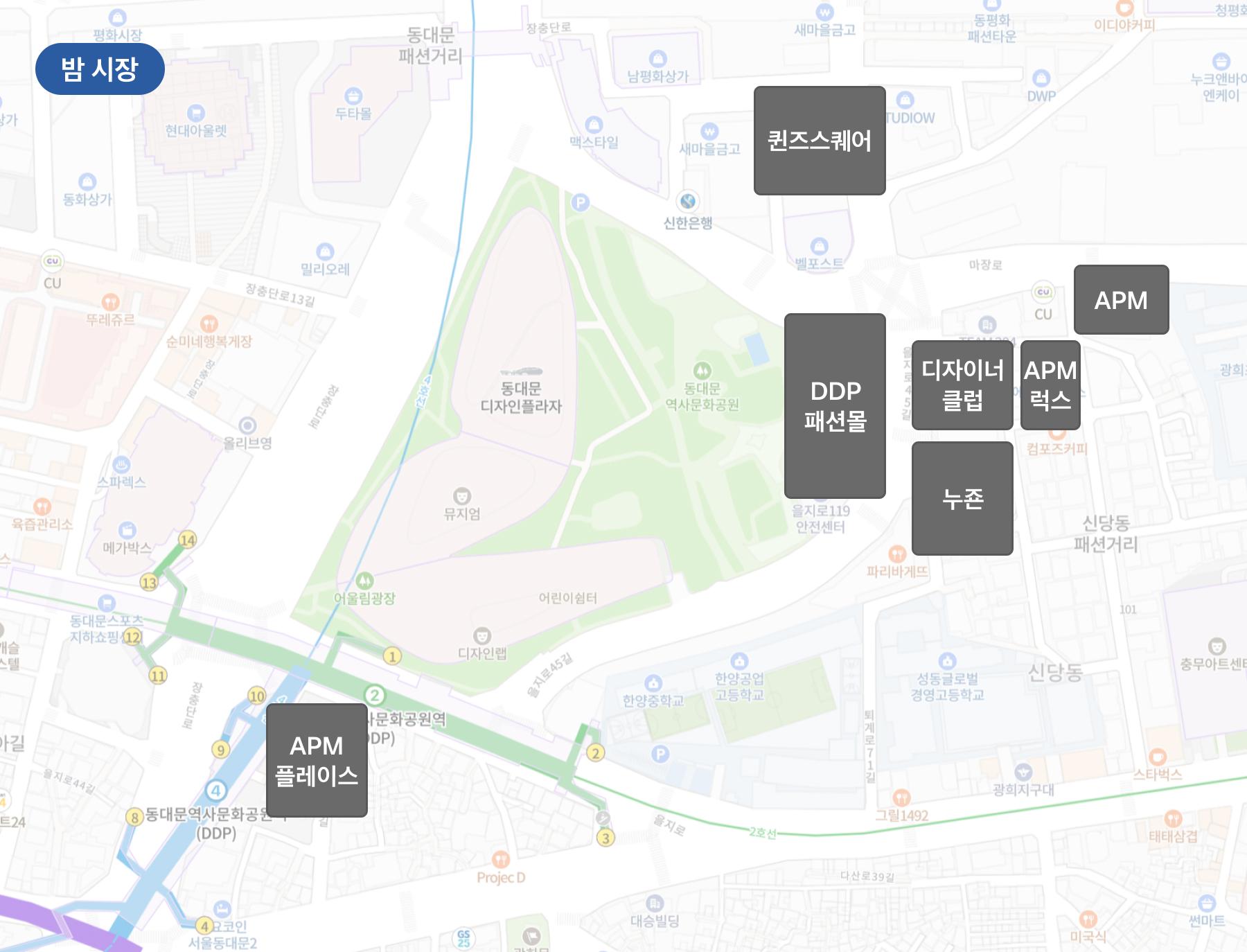 밤 시장은 ‘밤’부터 시작해 다음 날 새벽까지 운영되는 도매 시장이에요. APM, APM LUXE, 뉴존, 디자이너 클럽, 퀸즈스퀘어, DDP 패션몰(구 유어스)가 대표적인 밤 시장이죠.