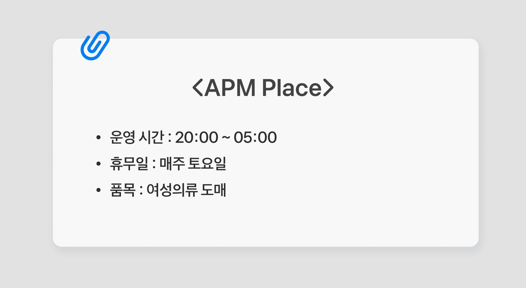 APM에서 조금 떨어진 곳에 위치한 APM 플레이스는 여성복 도매 업체들이 입점한 쇼핑몰이에요. 이곳은 소속 디자이너가 따로 있어서 상품의 퀄리티와 디자인이 아주 좋은 편이에요. 트렌드를 주도하는 대표 제품들을 살펴볼 수 있기 때문에 시장 조사 차원에서 주기적으로 방문해 보시는 것도 추천해요.