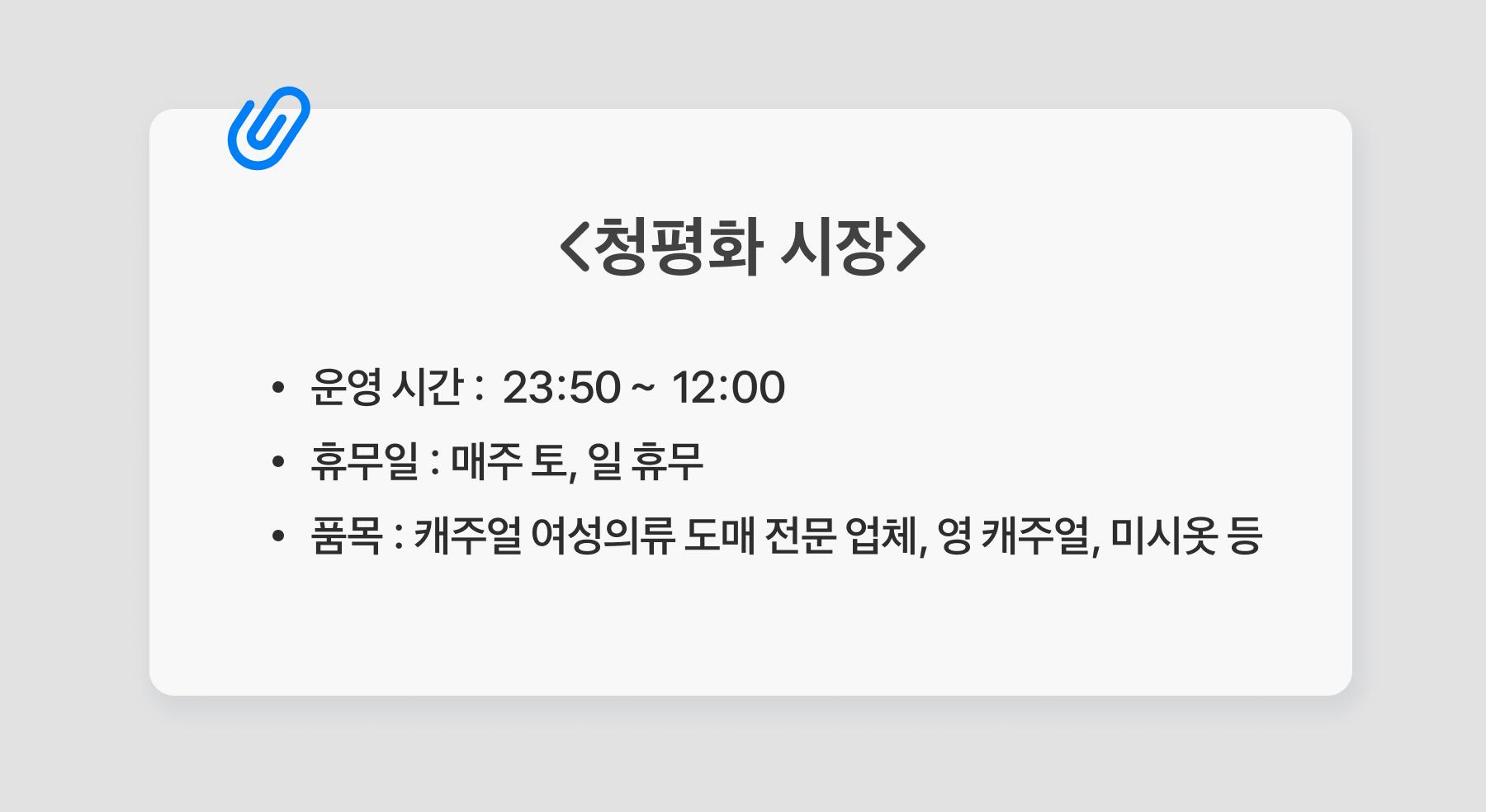 청평화 시장은 여성의류를 주로 판매해요. 청평화 시장은 ‘가성비'가 좋은 제품이 많아요. 캐주얼한 의류가 많고 3040 여성 고객이 좋아할 만한 의류가 많은 편이에요.