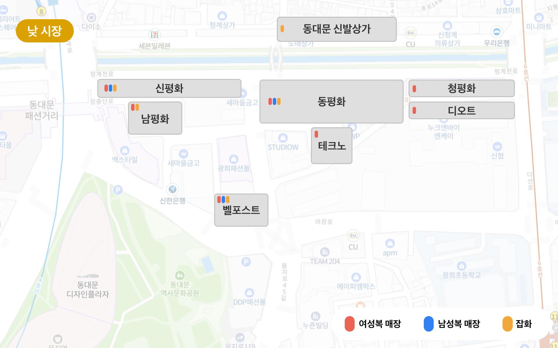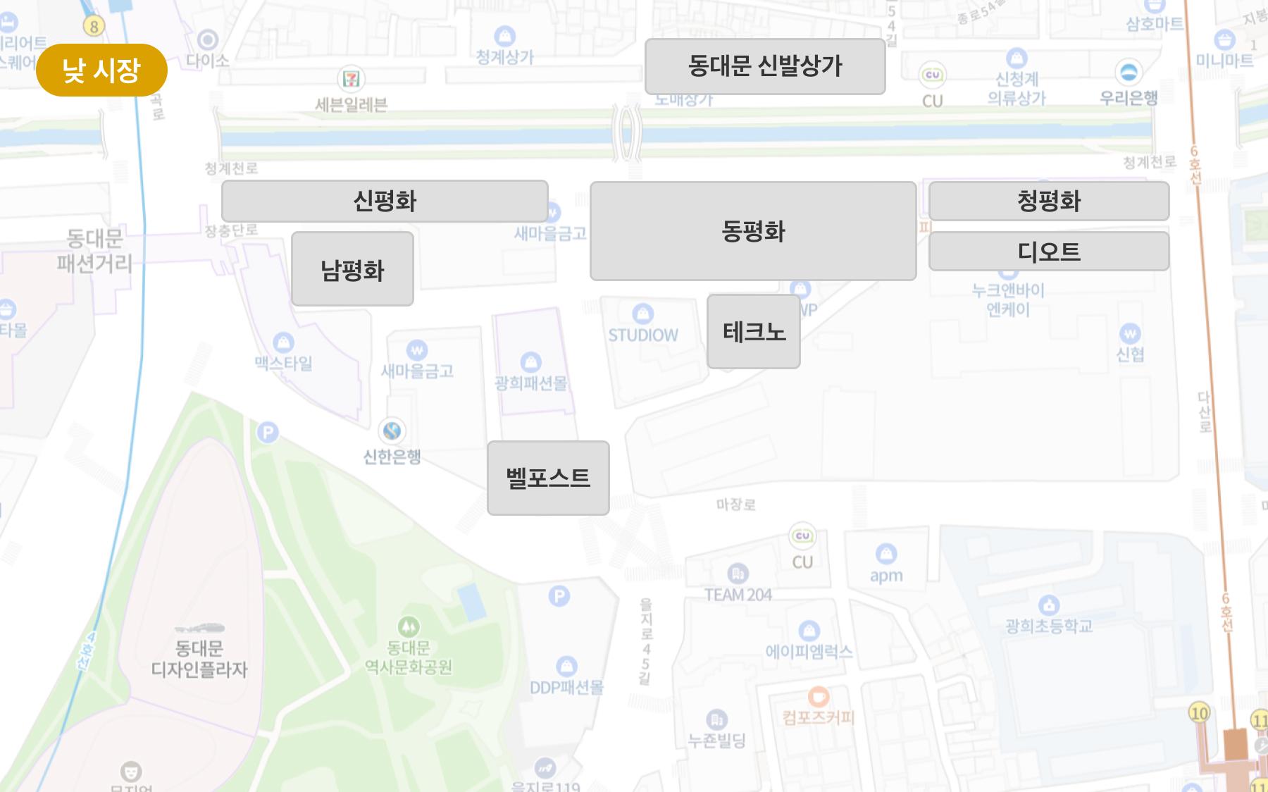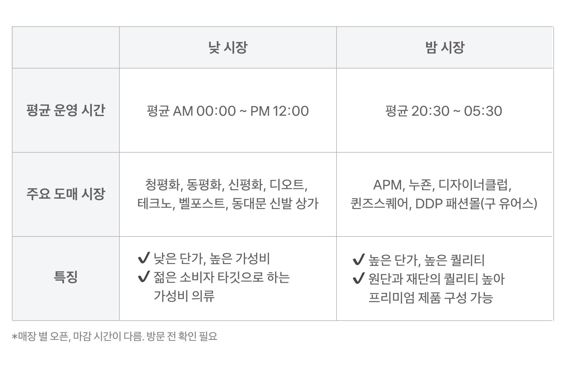 낮 시장은 평균적으로 자정부터 시작해 다음 날 ‘낮’까지 운영*되는 도매시장이에요. 청평화, 동평화, 신평화, 디오트, 테크노, 동대문 신발상가가 대표적인 낮 시장인데요.