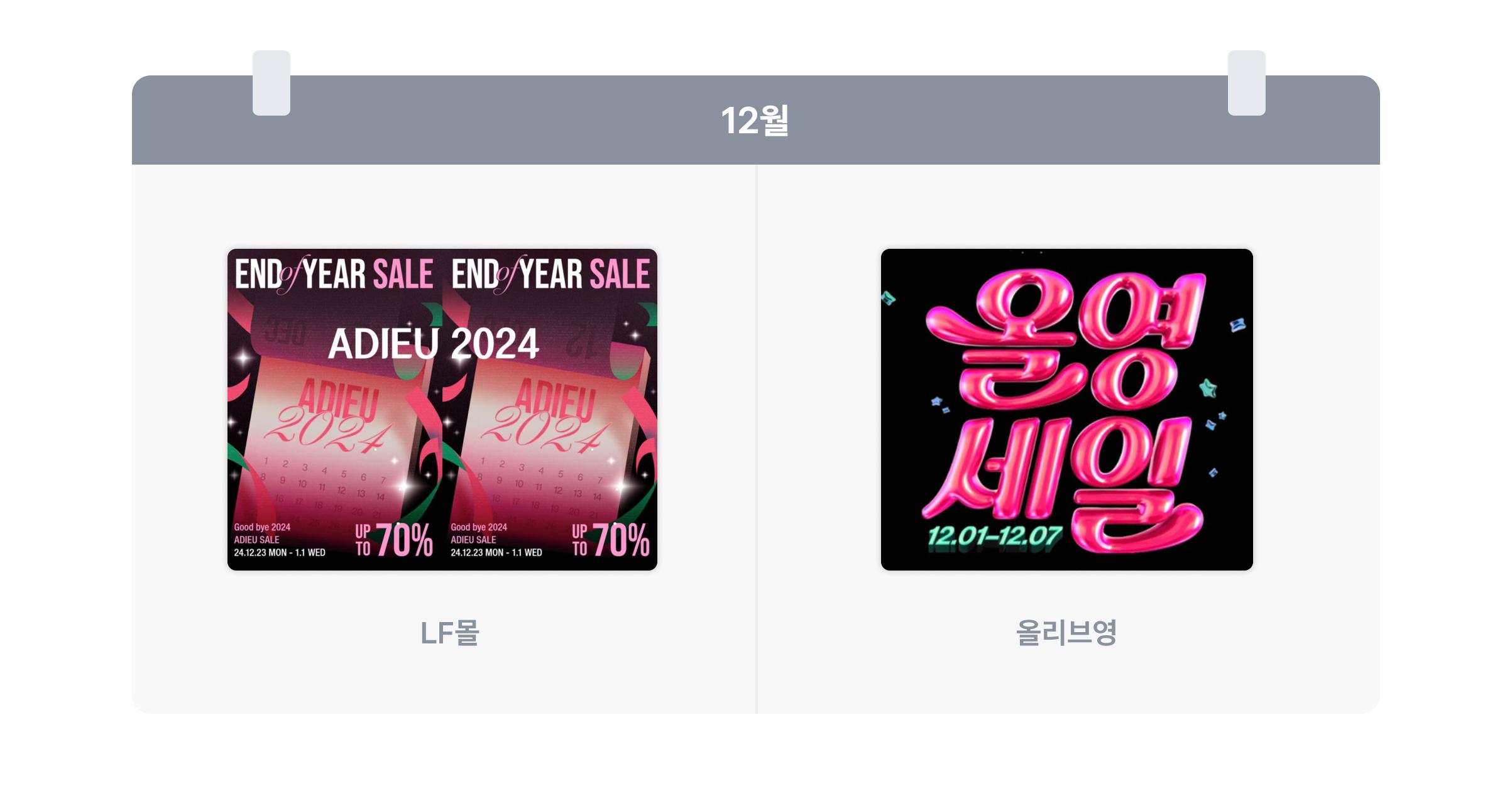 - 라이프스타일·리빙: 난방· 방한용품 할인전, 연말 선물세트 (캔들·디퓨저), 홈파티 용품, 신년 굿즈 (캘린더· 다이어리·플래너)