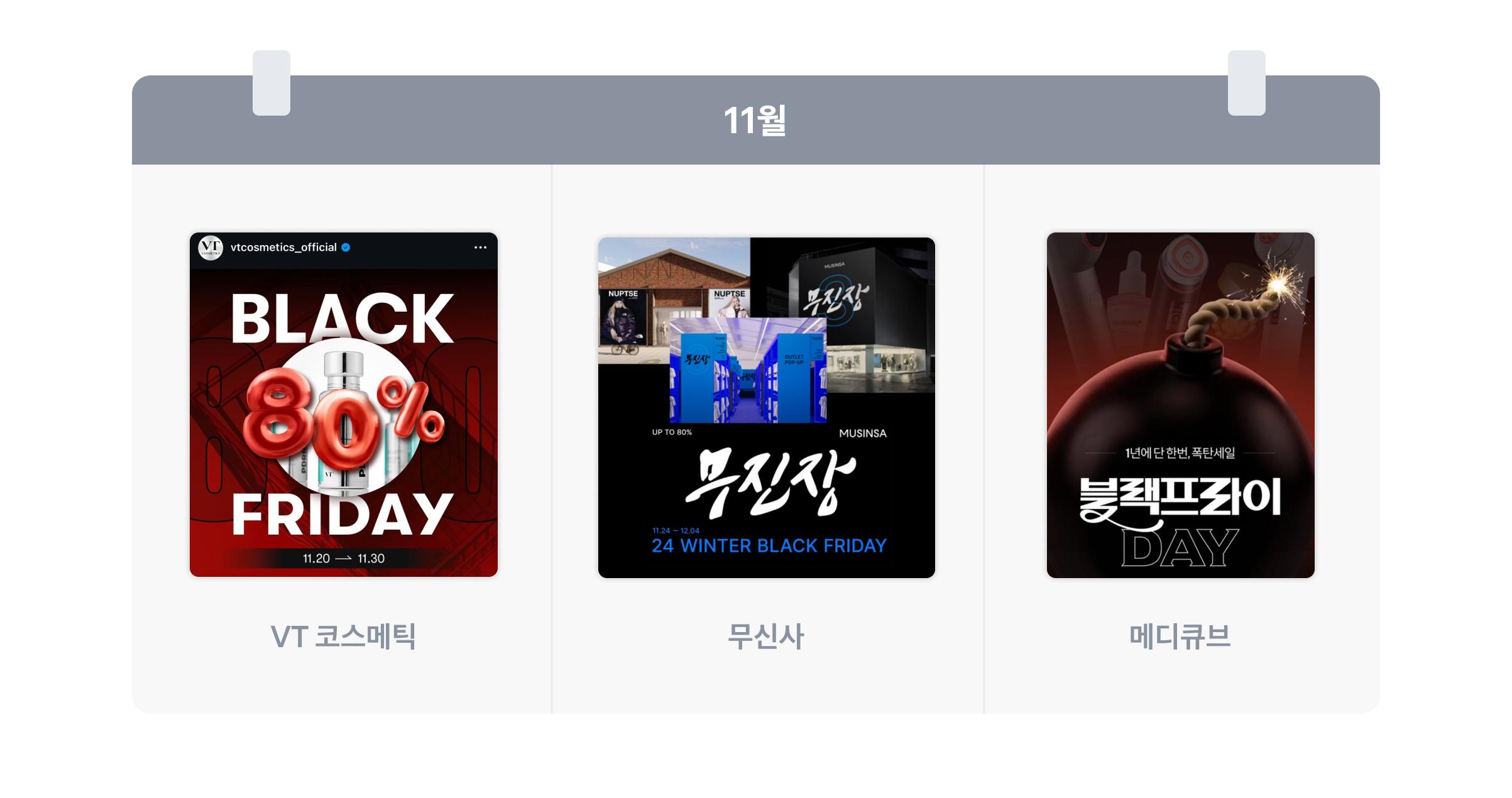 11월은 블랙프라이데이와 연말 쇼핑 시즌의 시작이에요. 가전, 패션, 뷰티, 시즌 한정 상품 등 연말을 겨냥한 소비가 늘어나는 시기죠. 블랙프라이데이 기획전, 연말 선물 추천, 한파 대비 같은 키워드를 활용해 프로모션을 준비하면 구매 전환율을 높일 수 있어요. 또한, 11월은 수능이 있는 달이기 때문에, 수험생과 가족을 위한 응원 세트, 수험표 인증 이벤트 등의 프로모션도 자연스럽게 연결할 수 있어요.