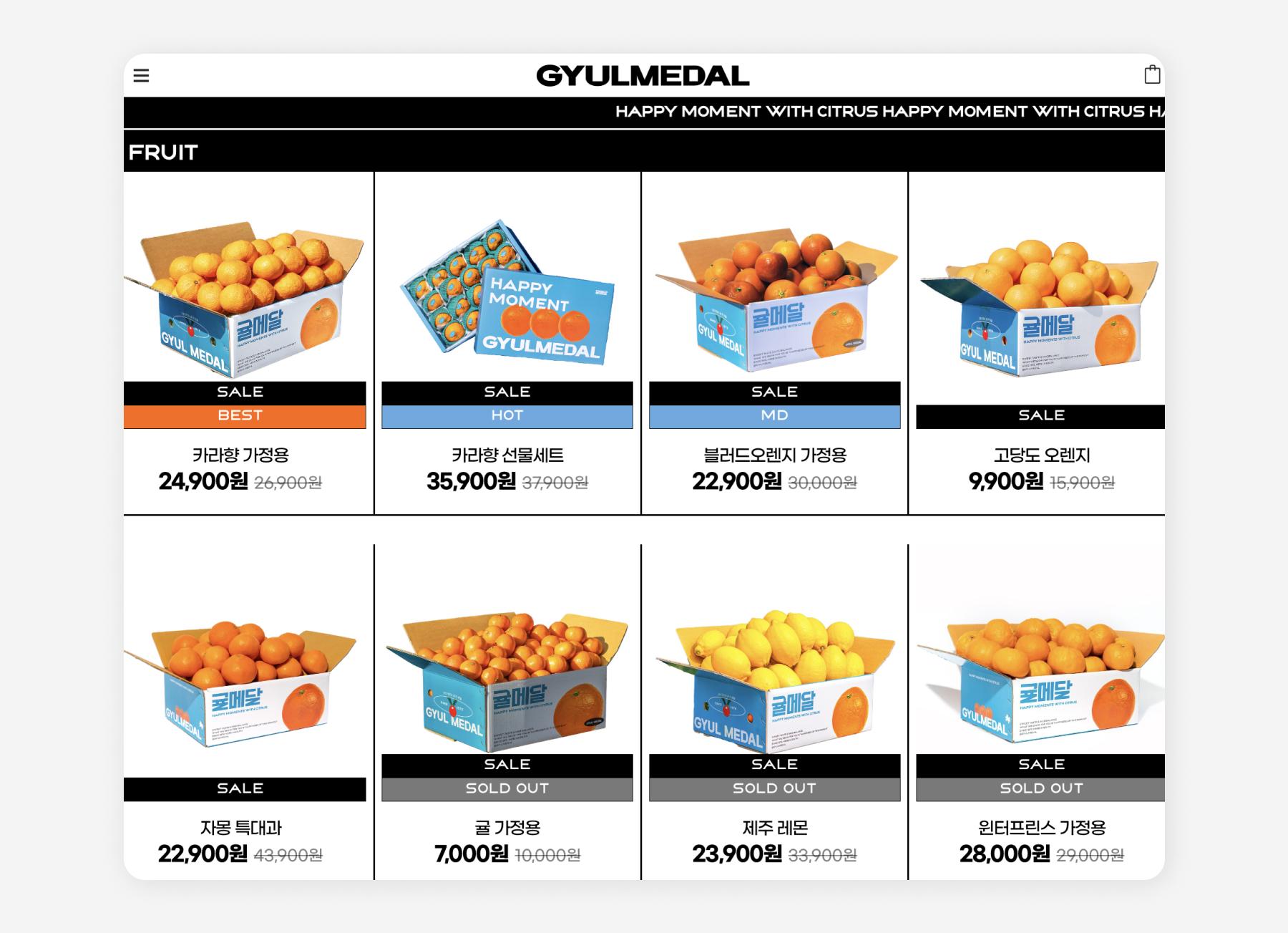 2020년 1인 창업으로 시작한 귤메달은 제주에서 나는 30여 종의 시트러스를 고객들이 쉽고 간편한 방법으로 섭취할 수 있도록 돕는 식품 브랜드입니다. 귤, 오렌지, 카라향 등 과일뿐만 아니라 주스와 가공식품(레드향 콩포트, 레몬딜 스프레드 등)도 판매하고 있습니다.