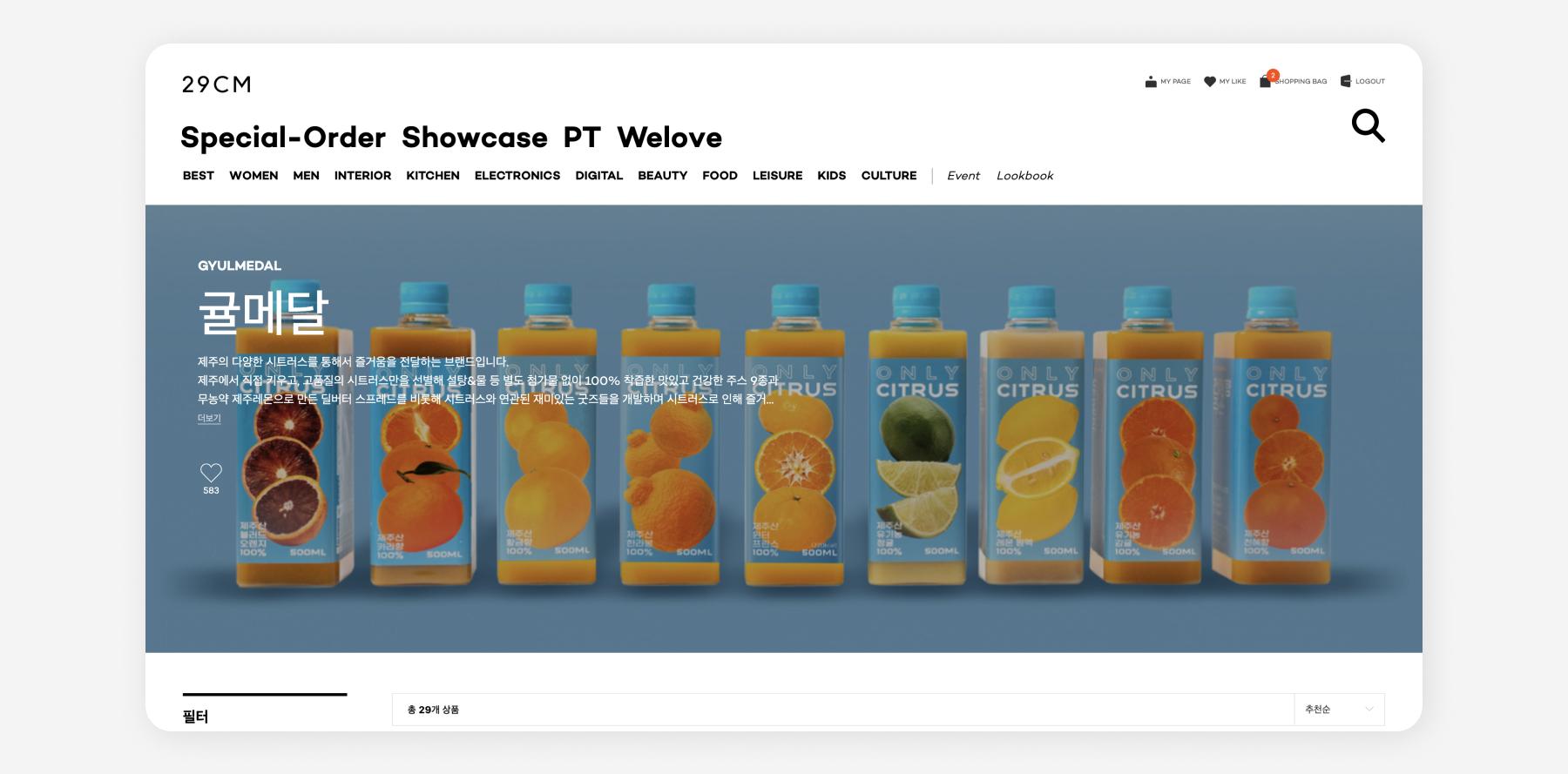 29cm는 선물 시장이 중요한 것 같더라고요. 같은 상품이어도 썸네일에서 선물 세트를 강조한다든가, 시즈널한 패키지 또는 29cm 단독 패키지를 구성하는 게 효과가 좋아요. 29cm에서 귤메달 제품을 구매하는 고객들은 브랜드를 좀 더 중요시하고, 선물로 줄 만한 것들을 찾는다고 보고 있어요.