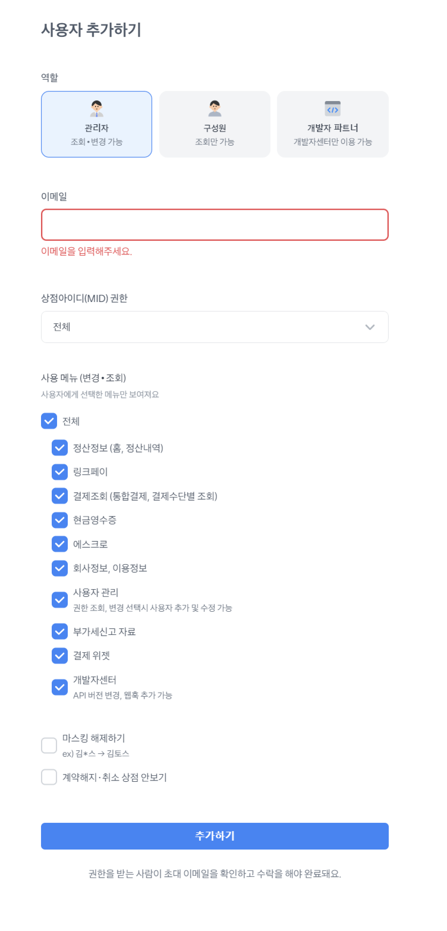 가맹점 상황에 따라 상점관리자를 여러명이 사용해야될 때가 있어요. 개발사에게 연동을 맡긴다던가, CS를 담당하는 직원에게 제한된 권한으로 열람하게 해야되는 상황도 있죠.
