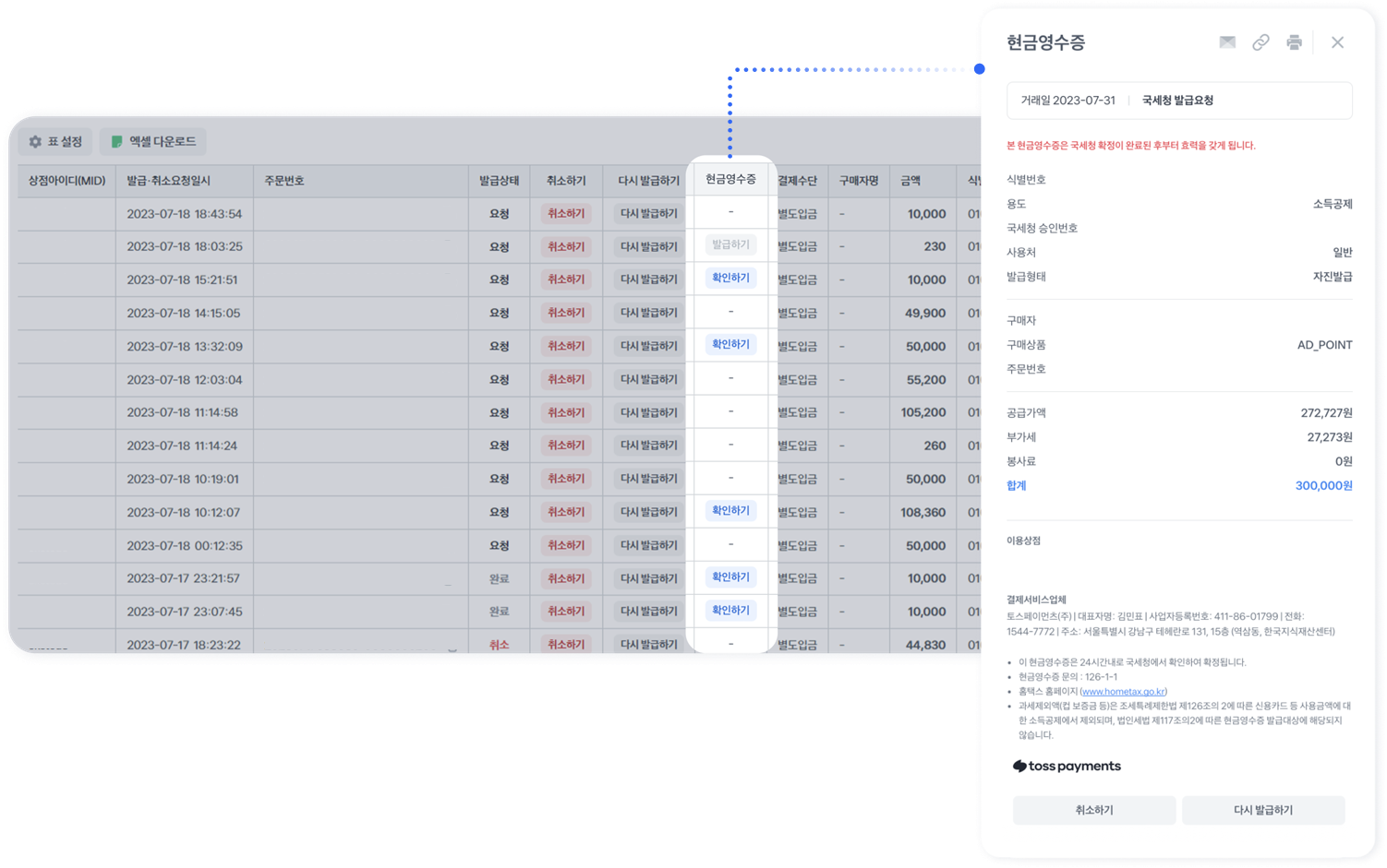 토스페이먼츠 상점관리자에서 PG결제가 아닌 현금 거래에 대해서도 현금영수증을 별도로 발급할 수 있어요.
