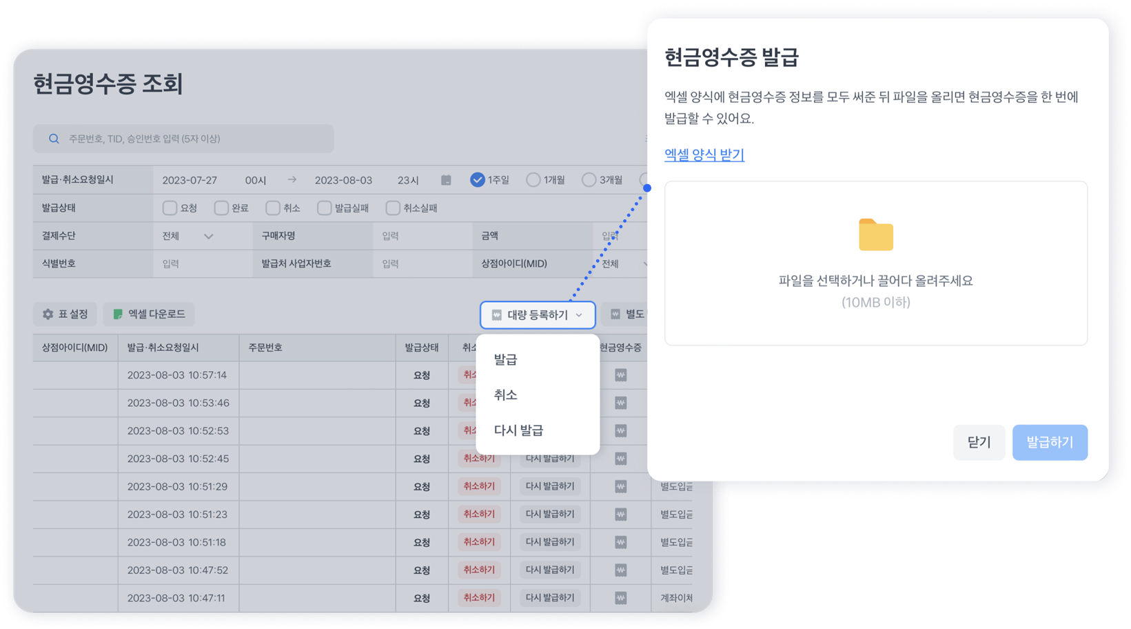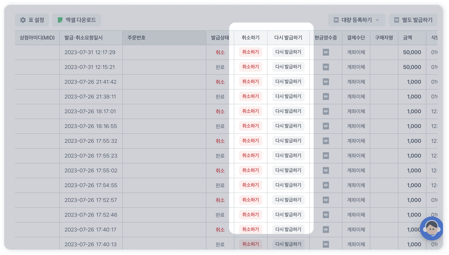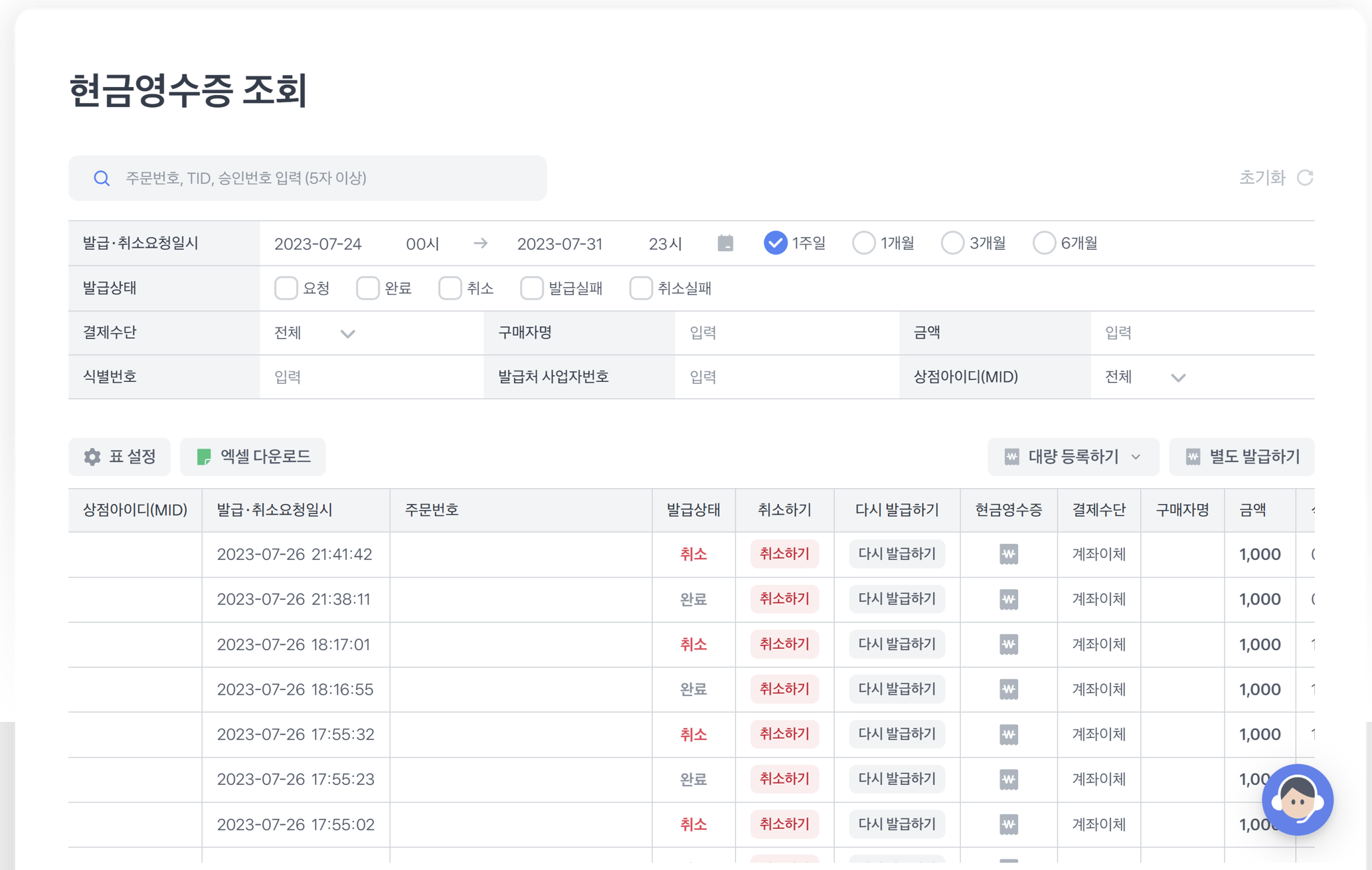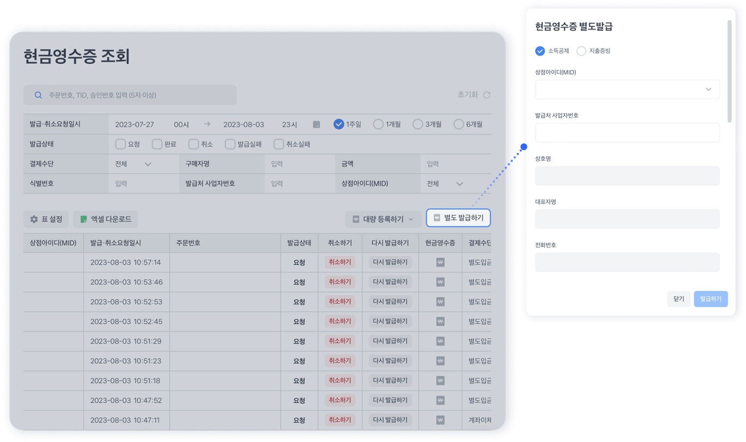 무통장입금(=가상계좌), 계좌이체, 별도발급 등 다양한 경로로 발생한 결제건의 현금영수증을 한 눈에 모아보세요.