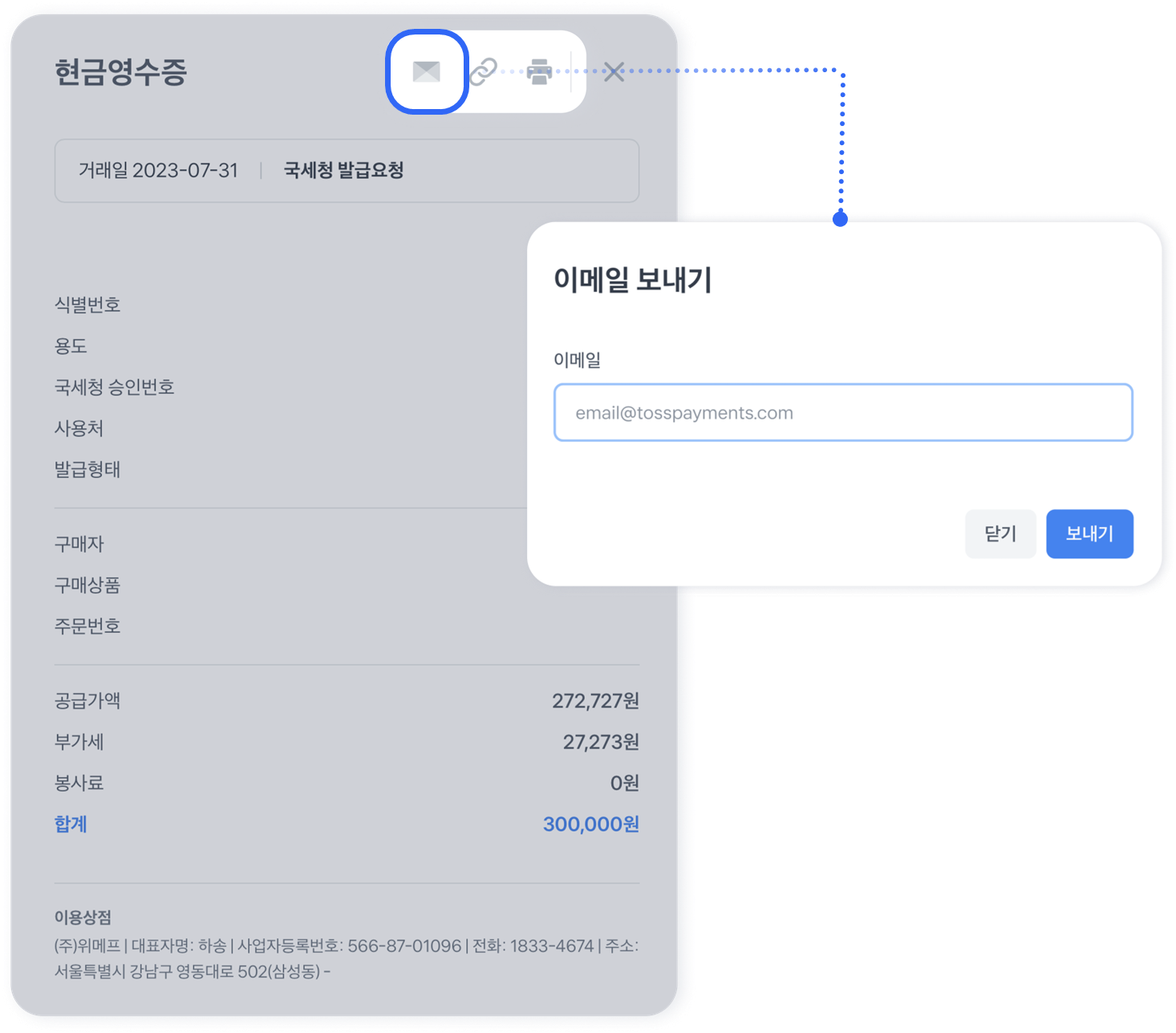 발행된 현금영수증은 메일이나 링크로 공유 할 수 있어요.