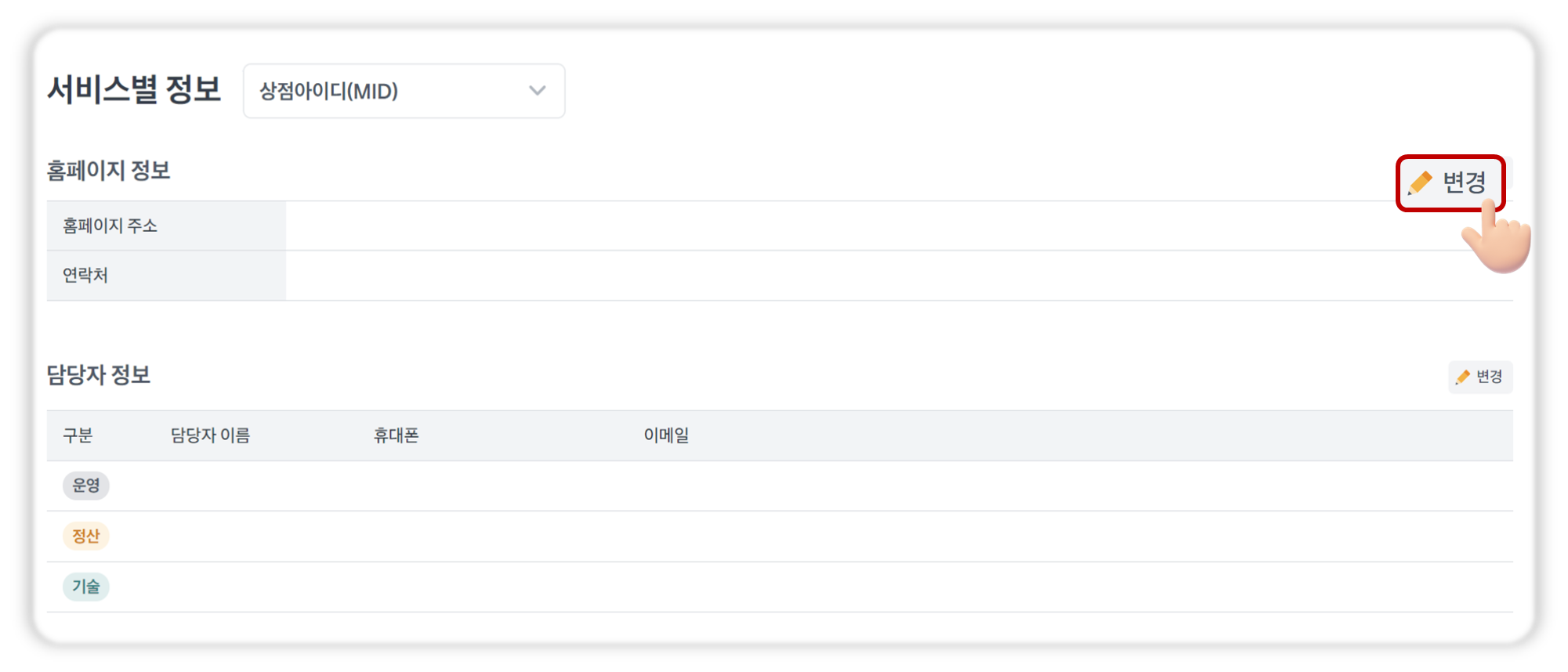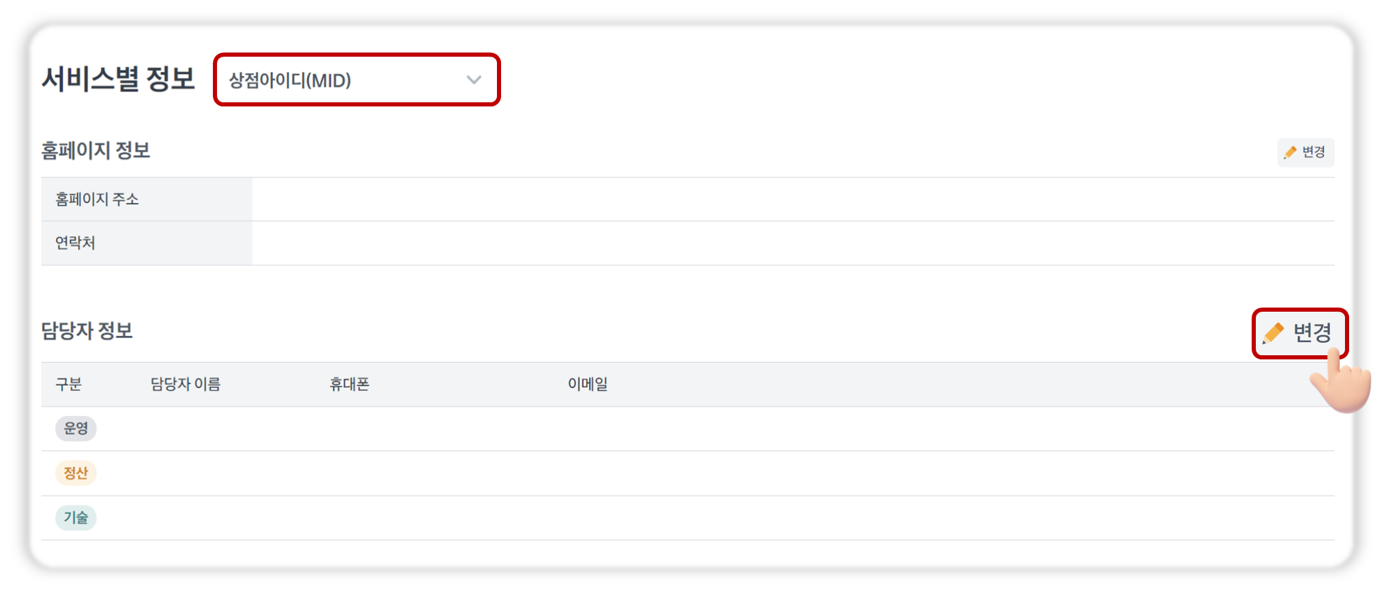 1️⃣ 담당자 정보를 변경 하려는 상점아이디(MID)를 선택한 후 오른쪽의 [ ✏️변경] 버튼을 클릭해 주세요