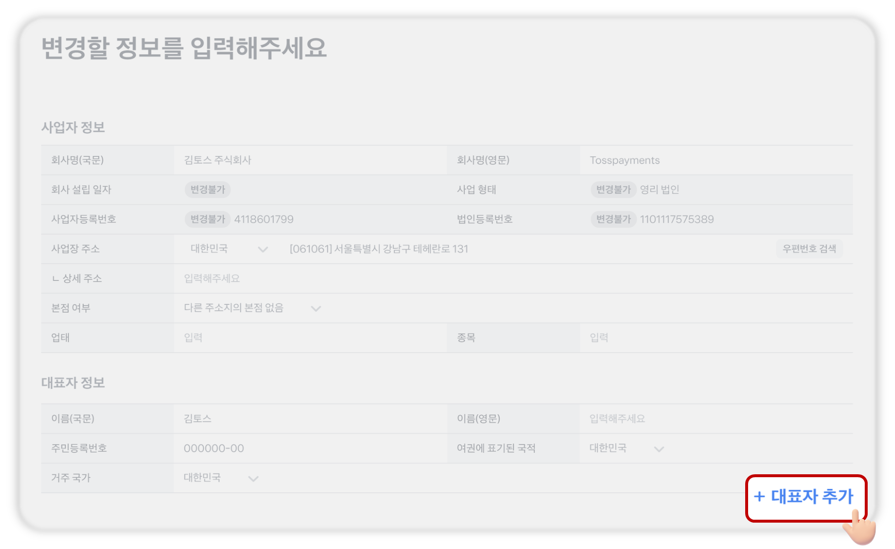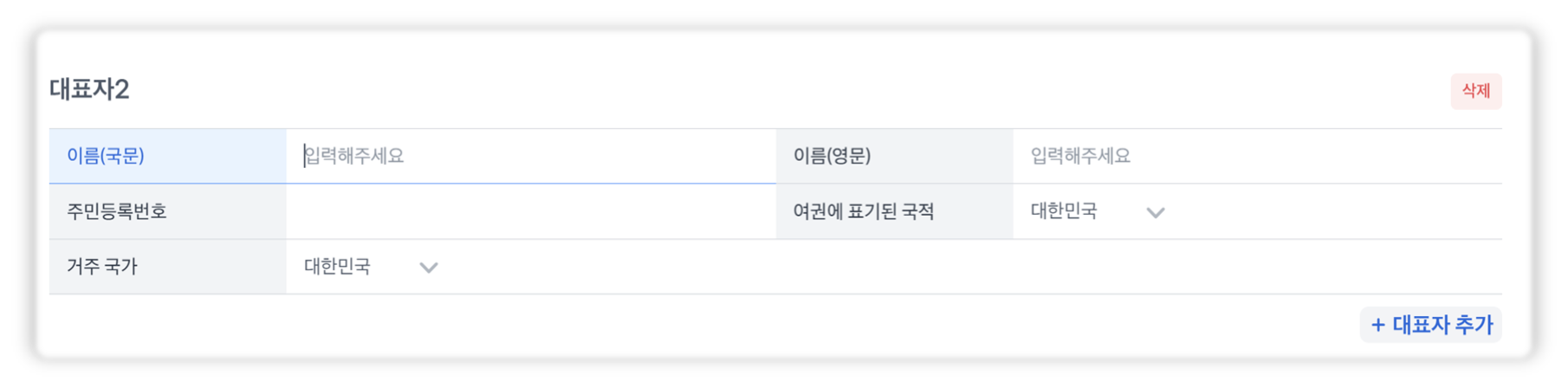 공동대표 등 대표자가 여러명인 경우, 하단의 [+대표자추가] 버튼을 클릭하여 추가할 수 있어요.