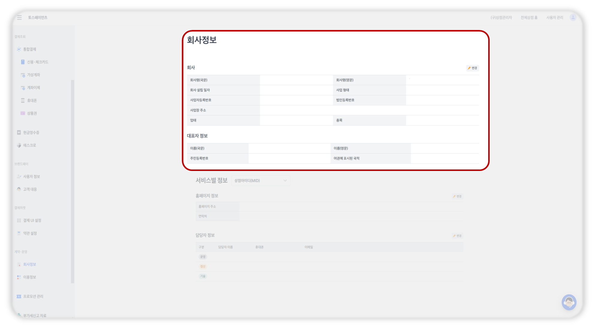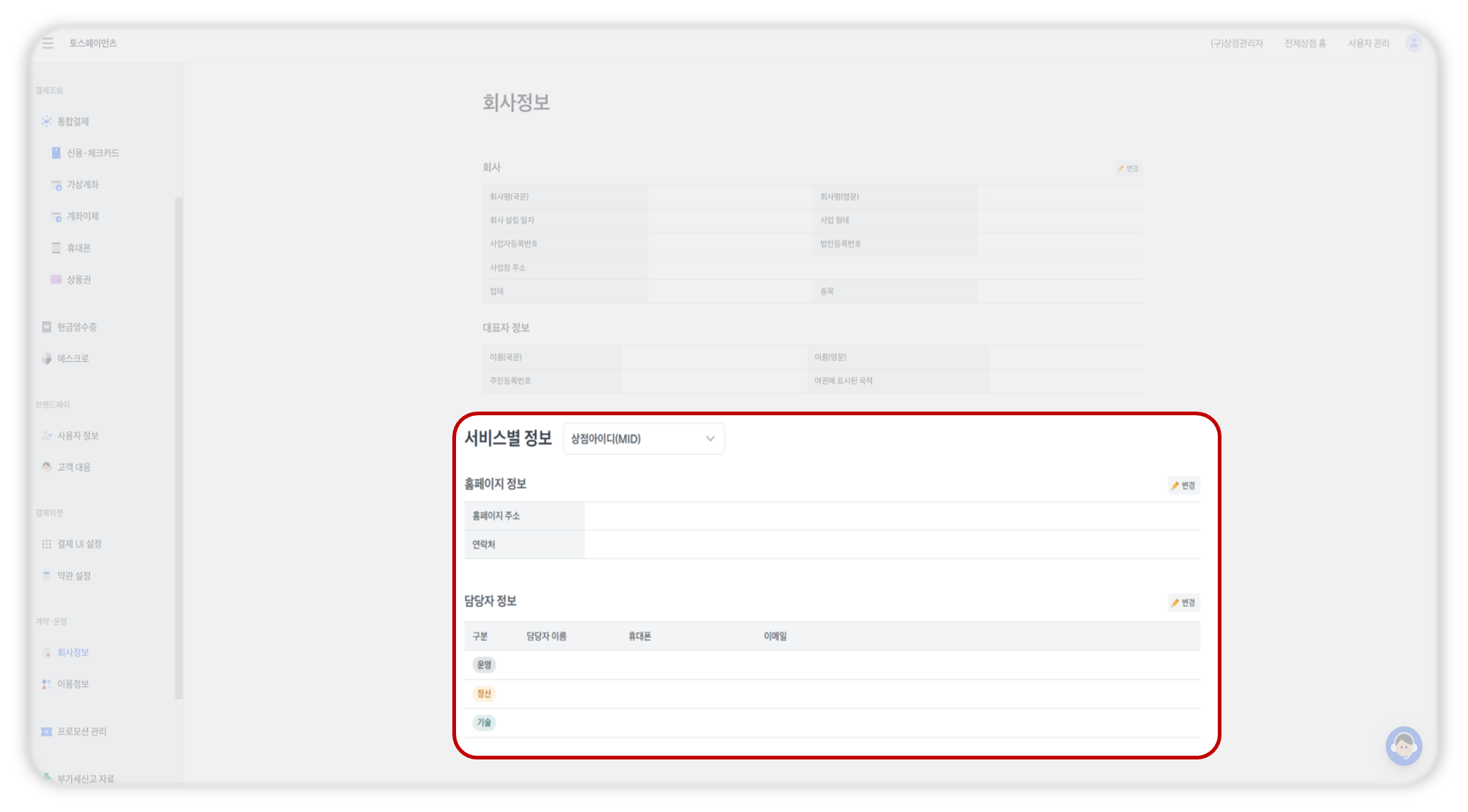 [회사정보] 메뉴는 공통정보인 사업자 정보 섹션과 상점아이디에 따라 변경되는 서비스별 정보 섹션으로 구성되어 있어요.