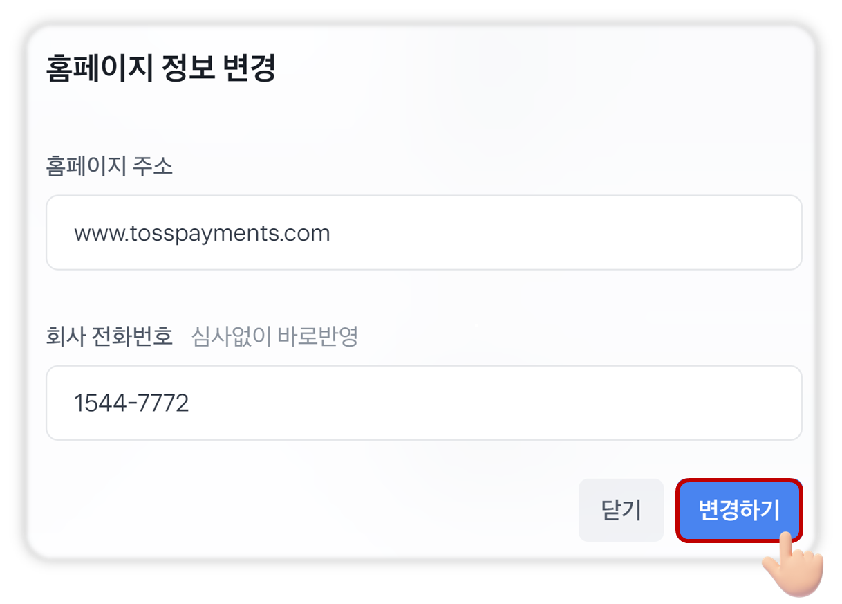 2️⃣ 변경 희망하는 홈페이지 주소와 회사 전화번호를 입력해주세요. 입력한 정보는 별도 심사 없이 바로 변경이 가능해요.