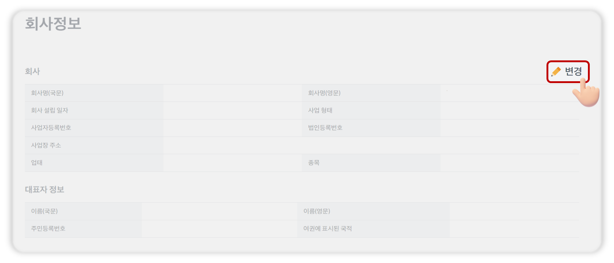 1️⃣ 회사정보 오른쪽의 [ ✏️변경] 버튼을 클릭 해주세요.