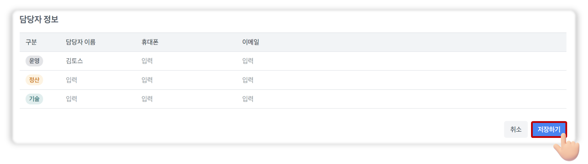 2️⃣ 새로운 담당자 정보를 기입한 뒤, [저장하기]를 눌러주세요