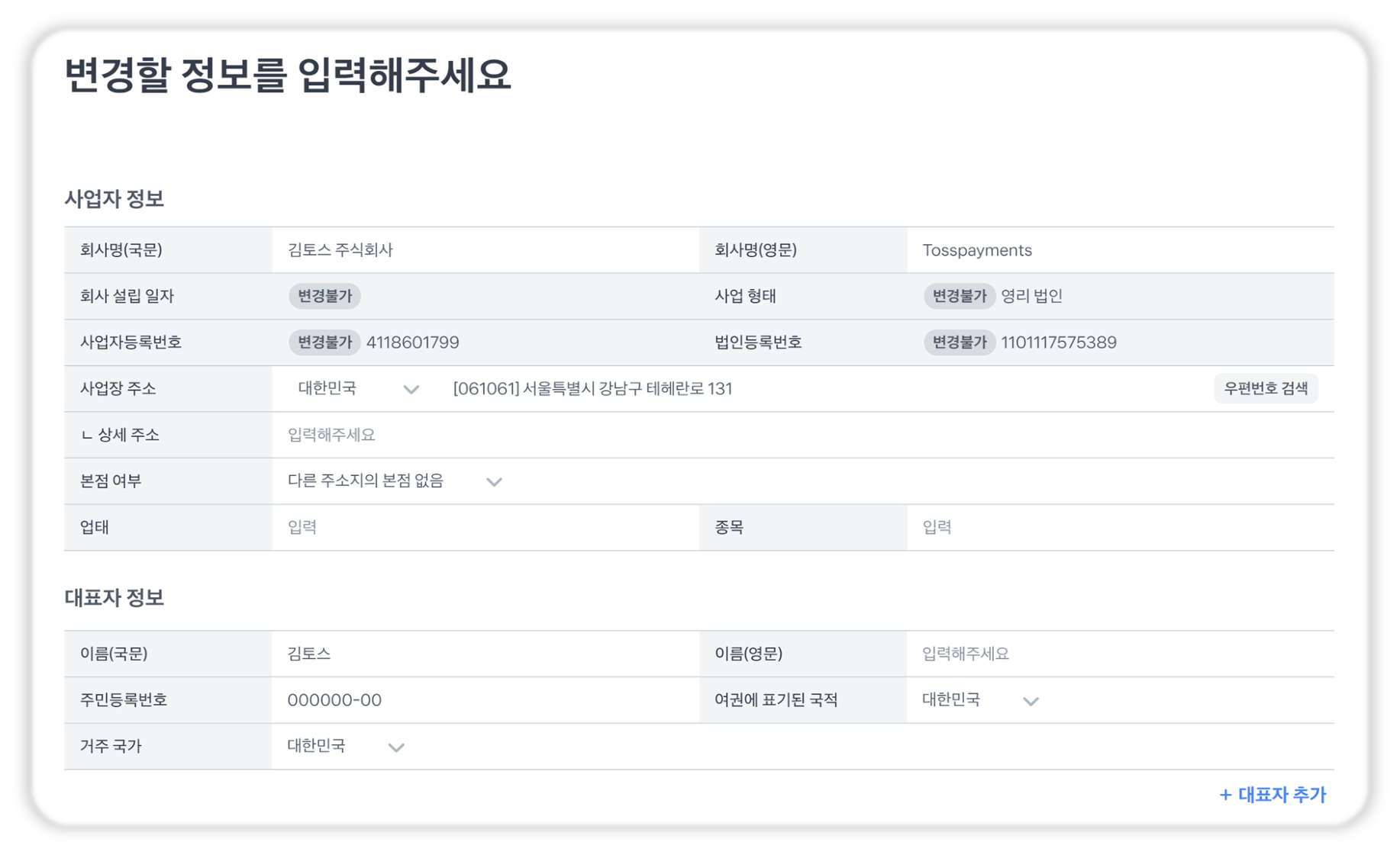 고객 확인 의무 사항에 따라 영문명을 포함하여 최신화된 대표자 정보로 변경이 필요해요. 변경할 정보에 따라 서류 첨부가 필요할 수 있으며 심사에 1~3영업일 소요될 수 있어요.