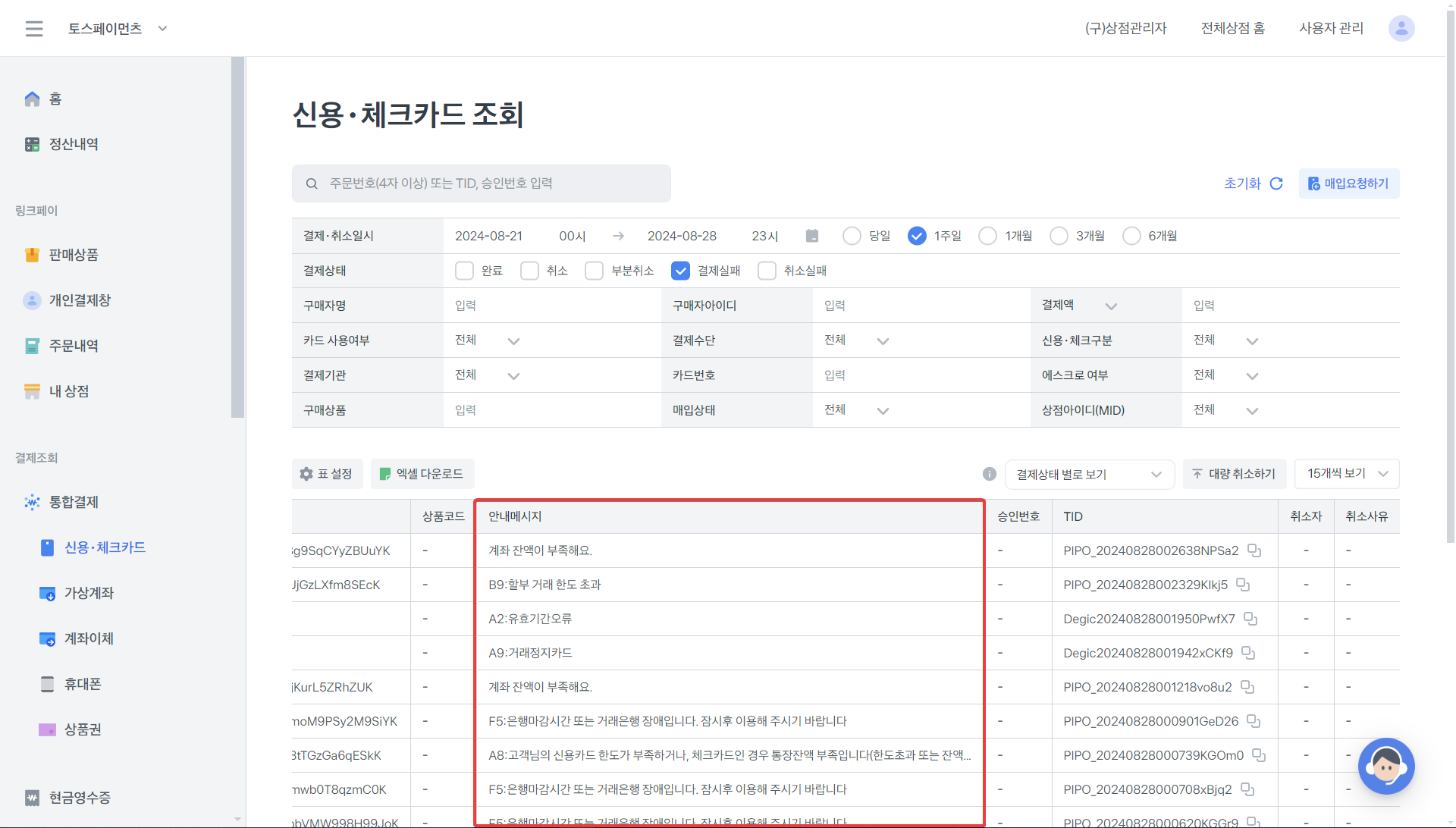 결제실패 또는 취소실패 사유 확인은 ‘안내메시지’ 항목을 확인하면 어떤 사유로 실패했는지 쉽게 알 수 있어요.