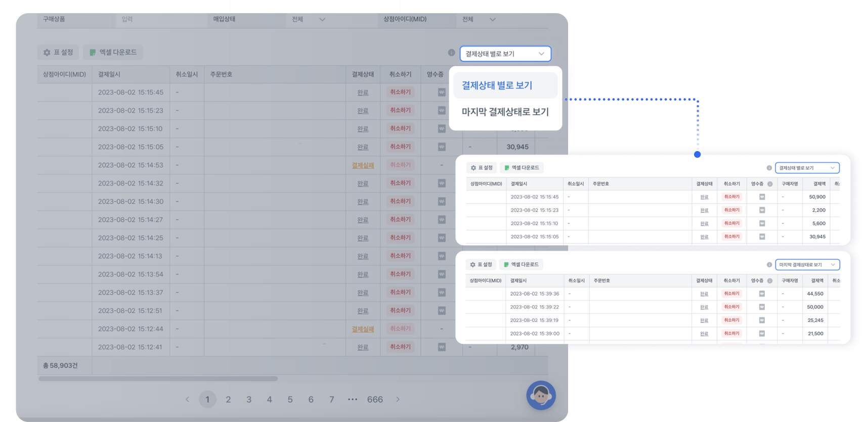 결제 내역을 결제상태 별로 나누어서, 또는 마지막 결제상태로 합쳐서 볼 수 있어요.