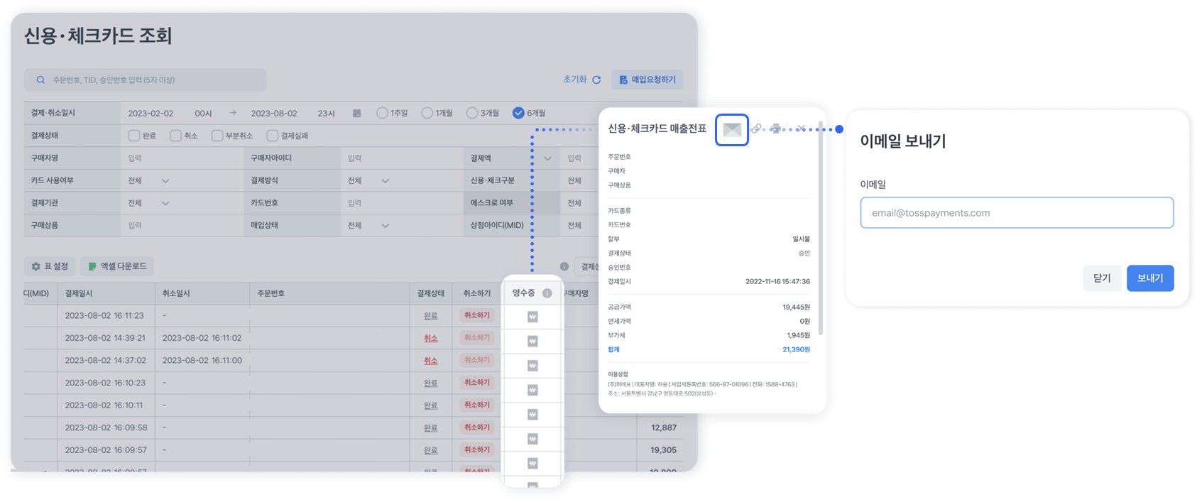 매출전표를 이메일로 보낼 수 있어요. 출력하거나, 링크로 공유도 가능해요.