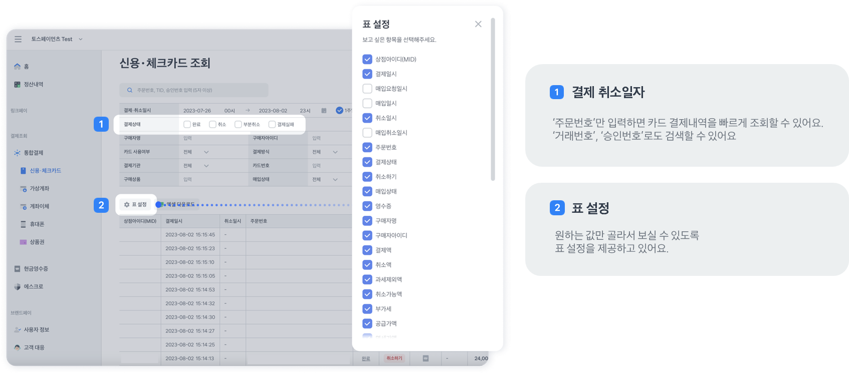 일자, 상점(상점 아이디), 결제수단 등으로 나누어 조회할 수 있어 편리해요.