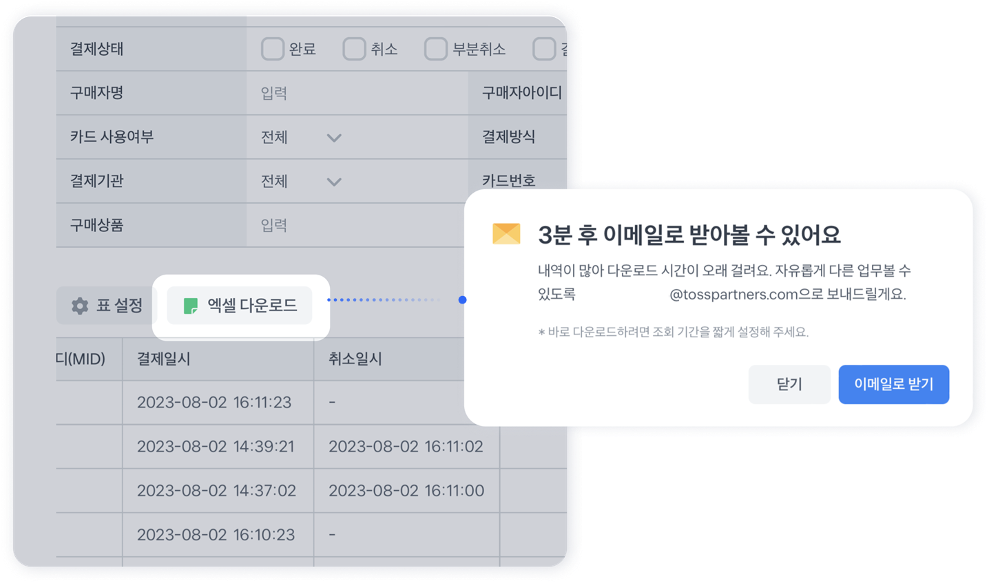 조회한 내역을 엑셀 파일로 빠르게 다운로드 할 수 있어요.