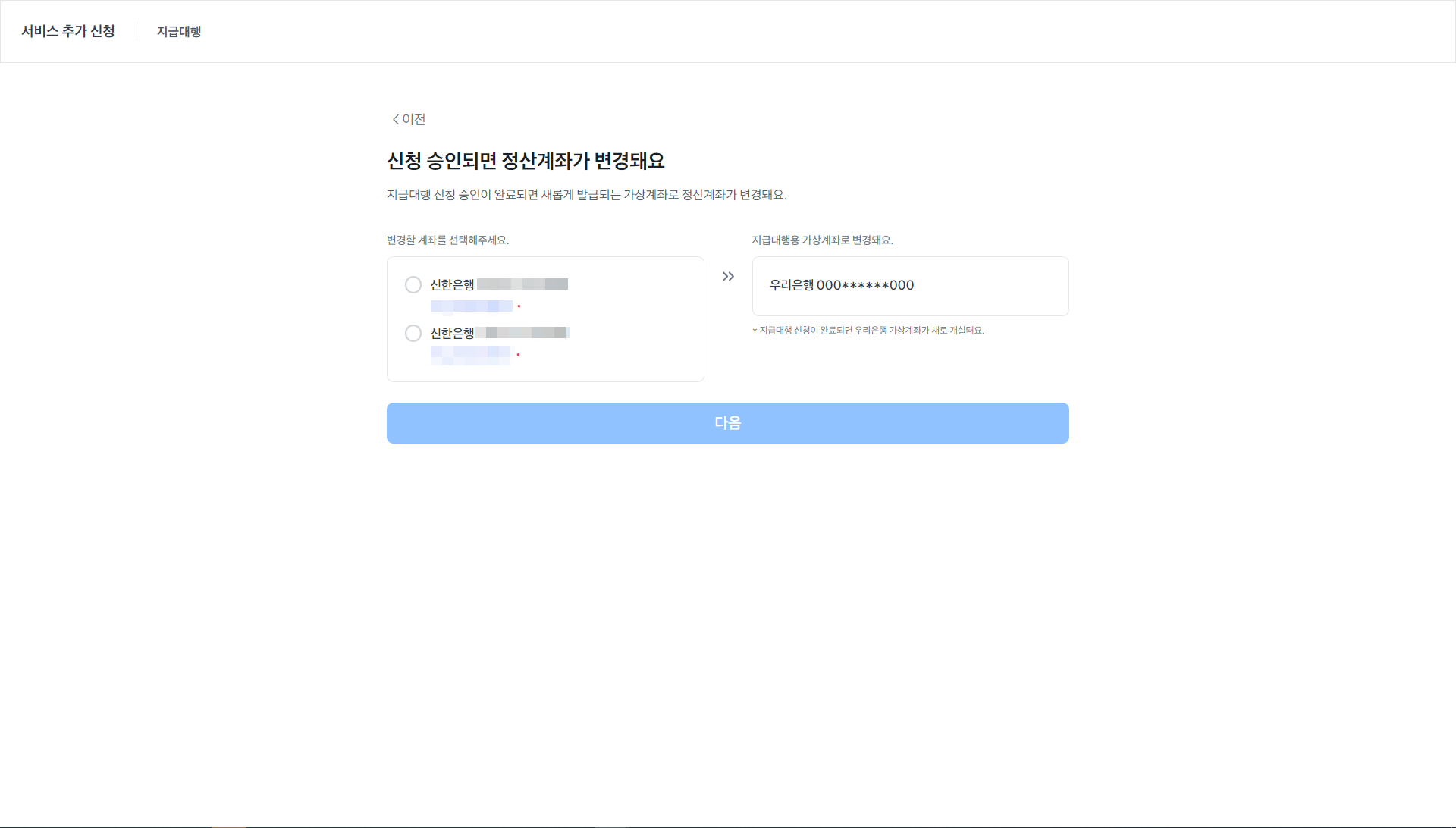 지급대행 서비스를 이용하는 정산 지급그룹은 지급보류 상태로 변경되고 지급대행 서비스 전용 가상계좌로 입금된 정산대금을 지급대행 서비스로 이용 할 수 있어요.
