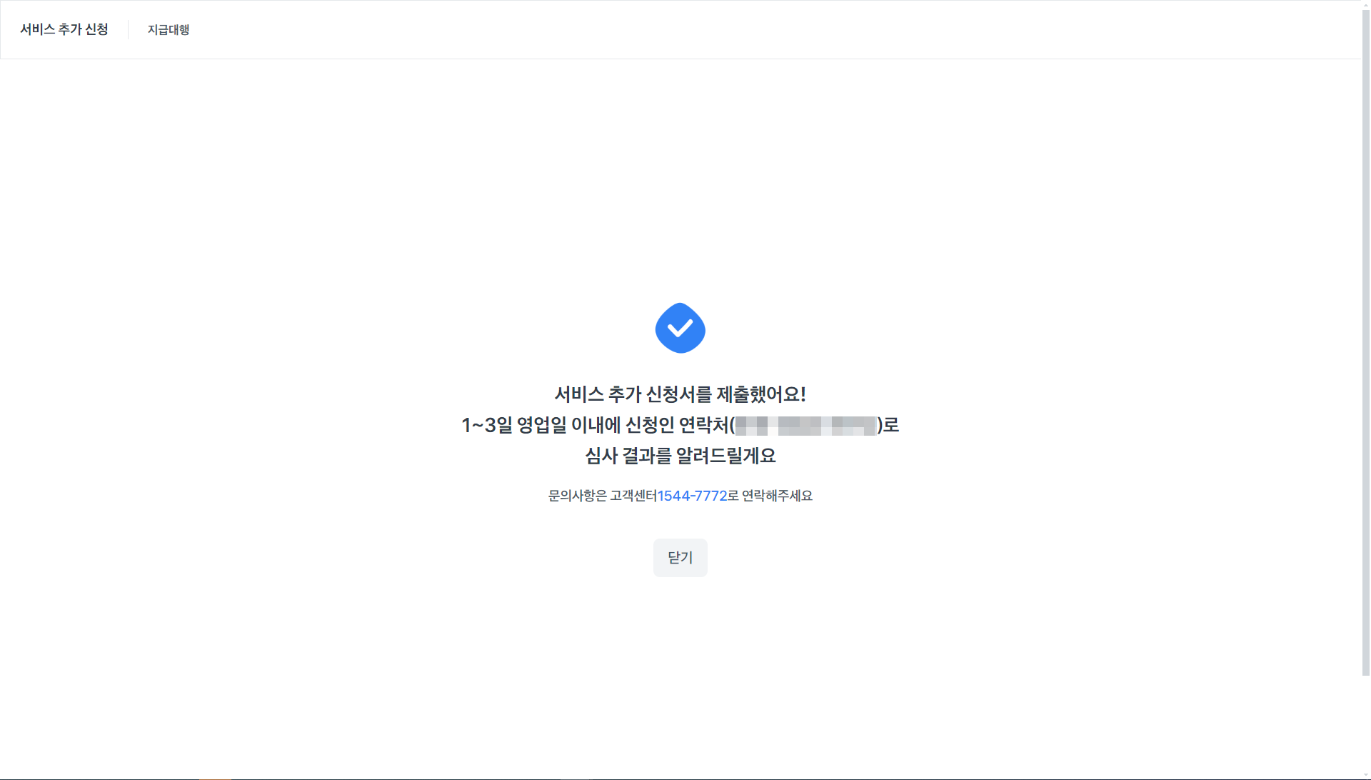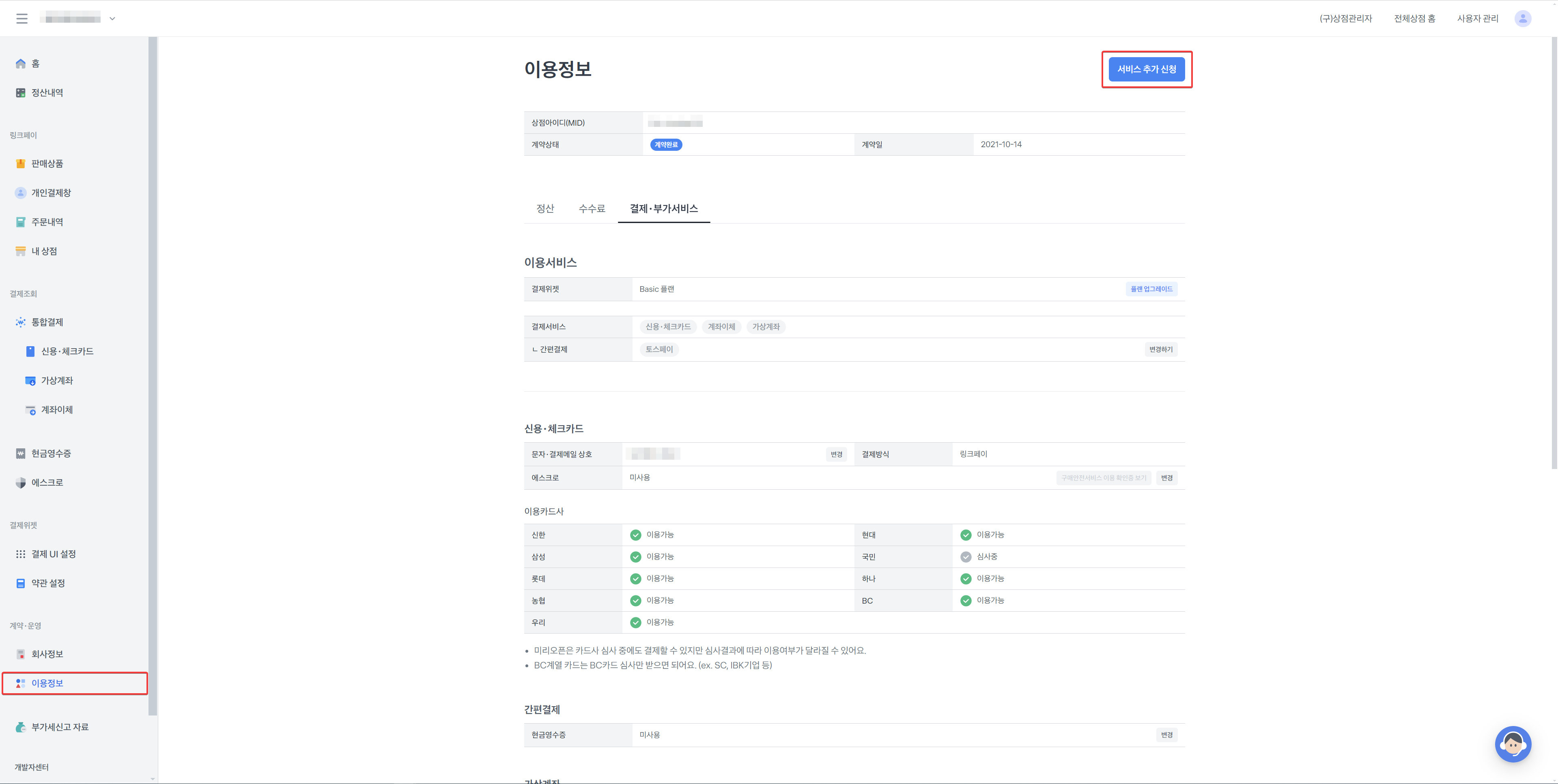 신청 경로: 상점관리자 > 이용정보 메뉴에서 우측 상단의 [서비스 추가 신청] 버튼을 클릭해주세요.
