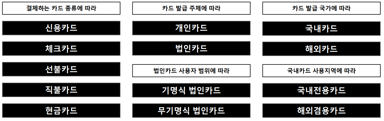 카드의 종류는 결제하는 종류에 따라, 카드 발급 주체에 따라, 카드 발급 국가에 따라 등 다양하게 분류해볼 수 있어요.