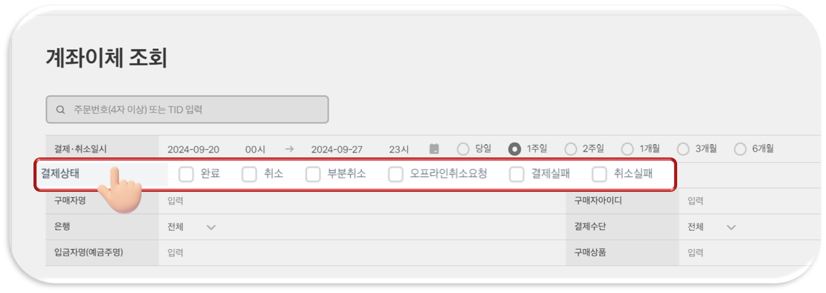- 결제수단 : 계좌이체 분류(퀵계좌이체, 브랜드페이, 간편결제, 일반 계좌이체 등)