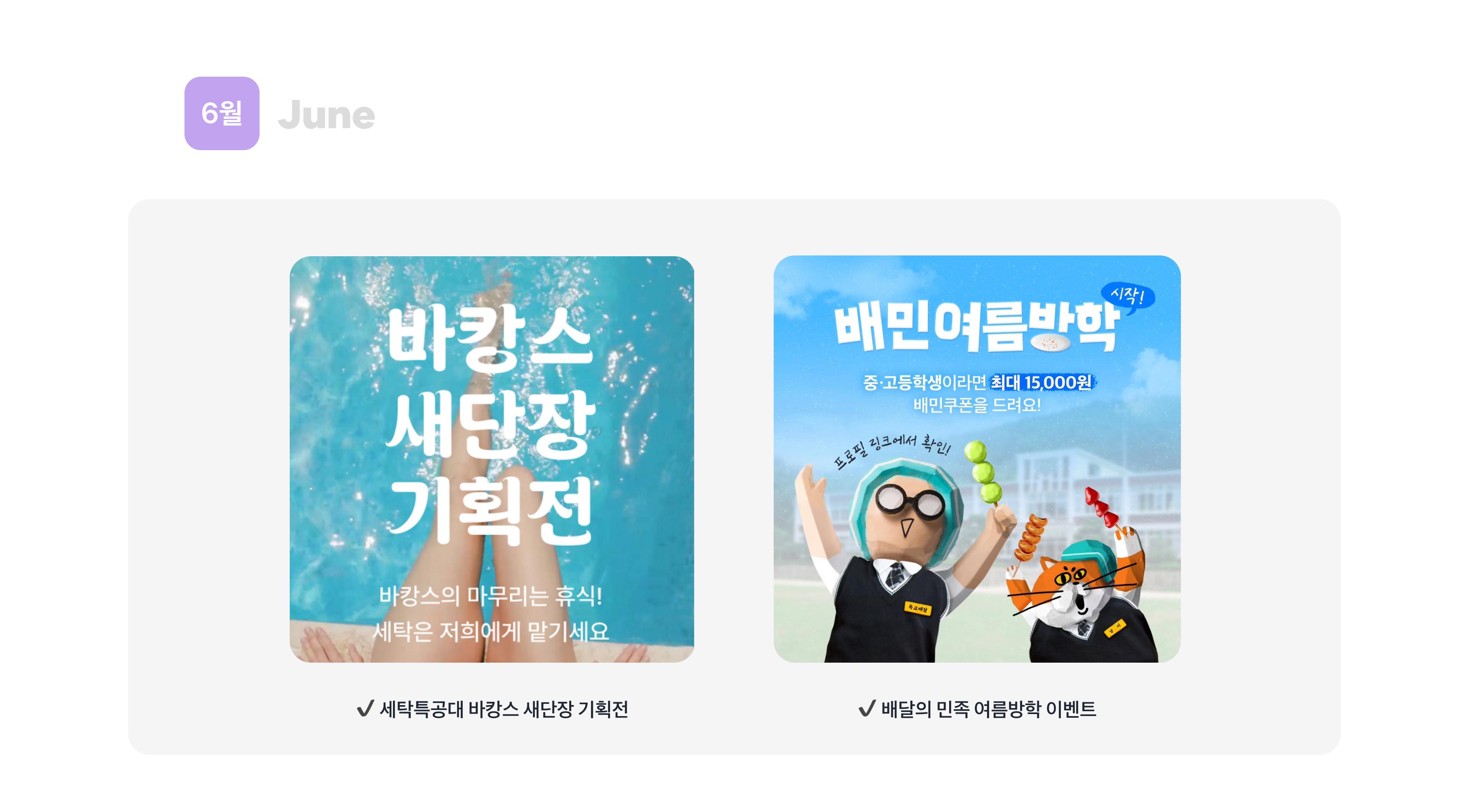 여행 상품, 여름옷, 수영복, 운동복 등을 주력 상품으로 파는 쇼핑몰이라면 6월에 기획전 및 이벤트를 진행하는 것이 좋아요. 상품 타겟군이 학생인지, 직장인인지 등을 잘 따져서 그들에게 꼭 맞는 맞춤 프로모션을 진행한다면 더 큰 효과를 보실 수 있을 거예요.