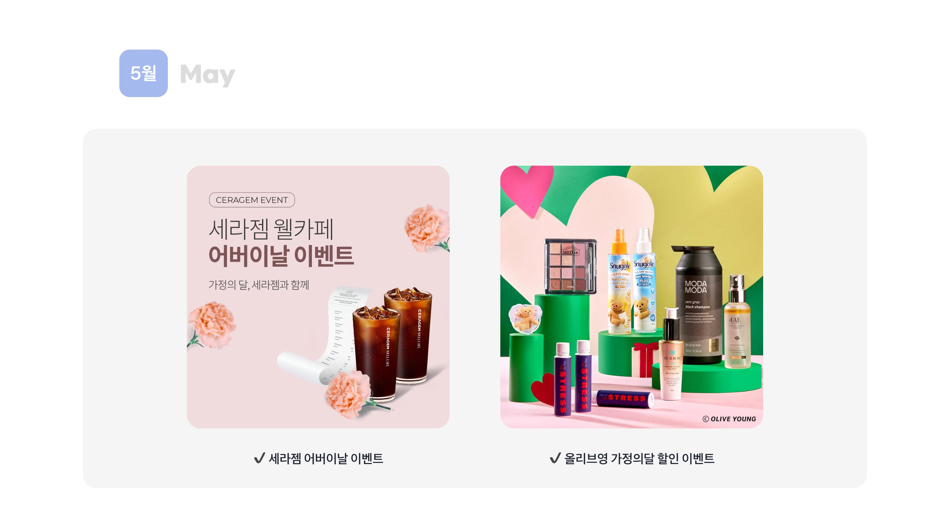 5월은 챙겨야 할 기념일이 많은 달인데, 어린이날, 어버이날, 부부의날 등 가족과 관련한 이벤트가 많아요. 그래서 ‘5월 가정의 달 이벤트’와 같이 가족이라는 하나의 키워드로 묶어 프로모션을 진행하기도 해요.