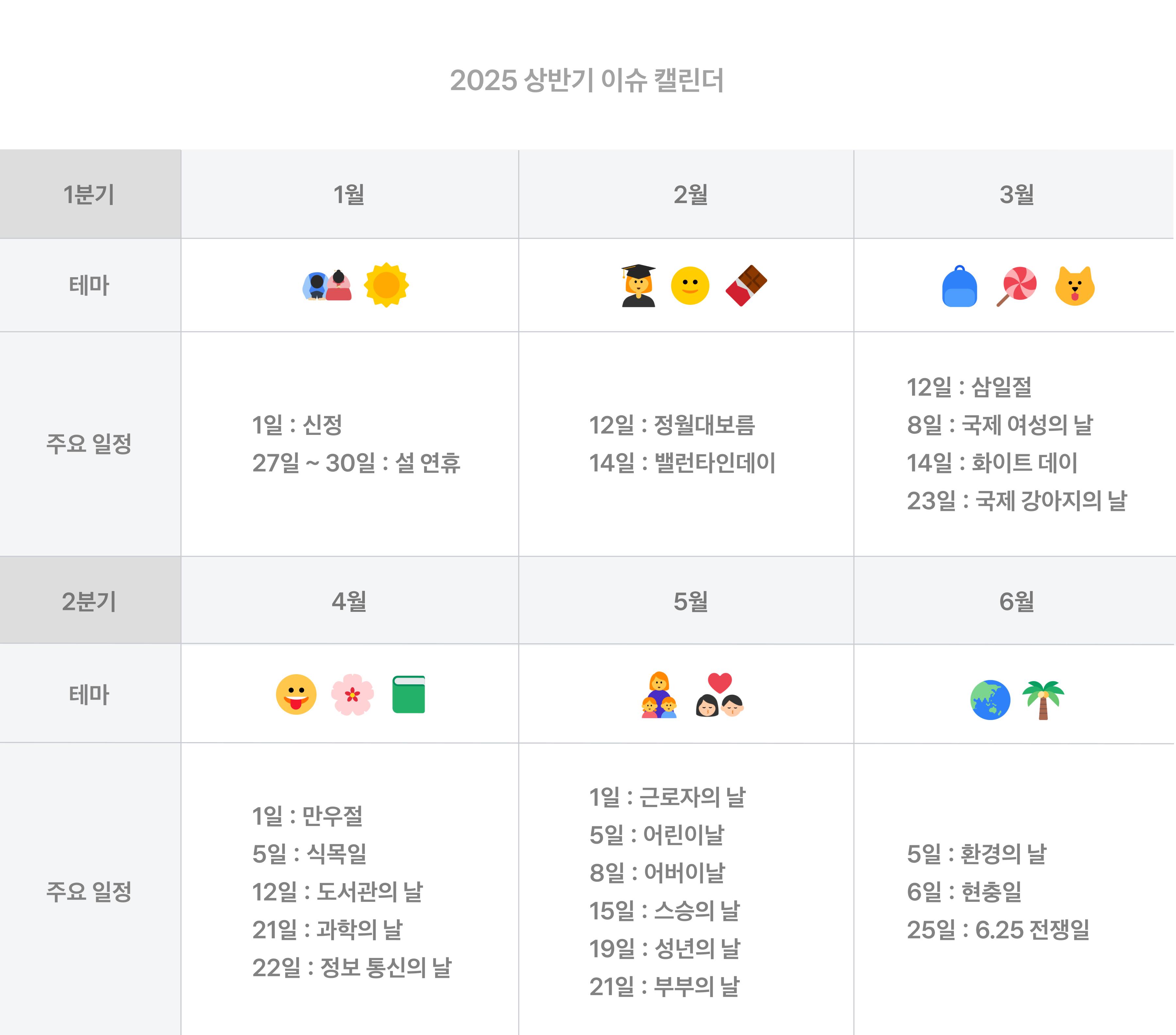 지금까지 2025년 상반기 일정을 살펴봤어요. 이를 참고하시어 빈틈없는 상반기 프로모션 계획을 세워 보세요!