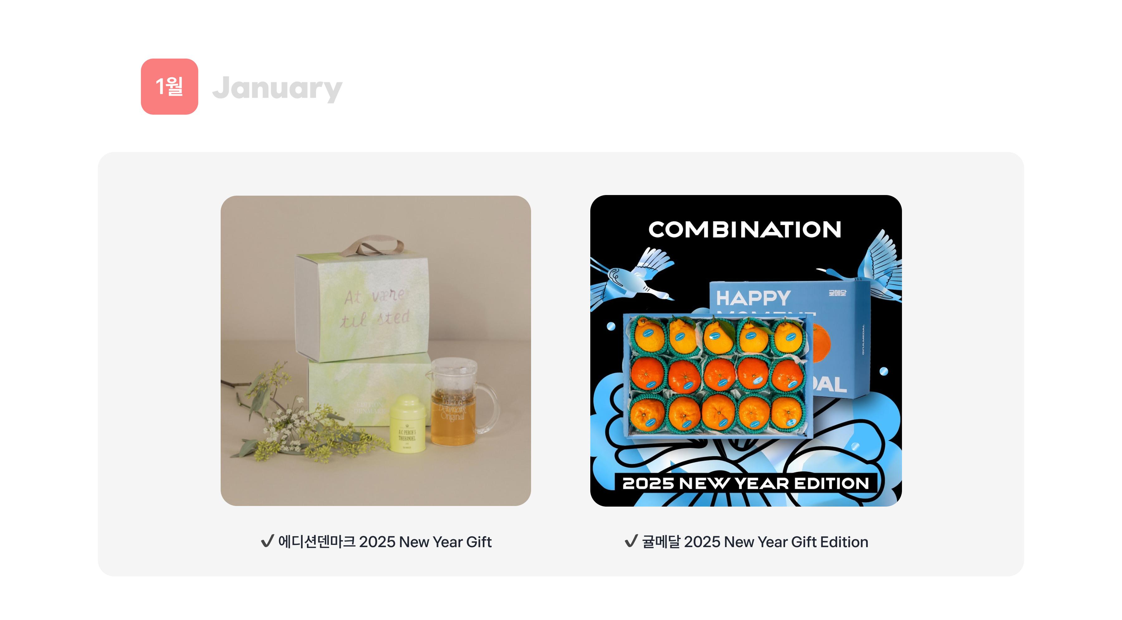 또 1월 프로모션에는 각 해의 특성을 강조하는 방식이 곧잘 활용되곤 하는데요. 올해는 을사년 ‘푸른 뱀의 해’라고 하니 프로모션 시 관련 이미지를 활용해 봐도 좋겠어요. 더불어 추석 연휴와 함께 1년 중 가장 긴 연휴인 설 연휴가 올해는 1월에 있어요. 이 시즌엔 가족과 관련된 아이템이 명절 선물로 많은 인기를 끌어요. 이 점을 꼭 활용해 보세요.