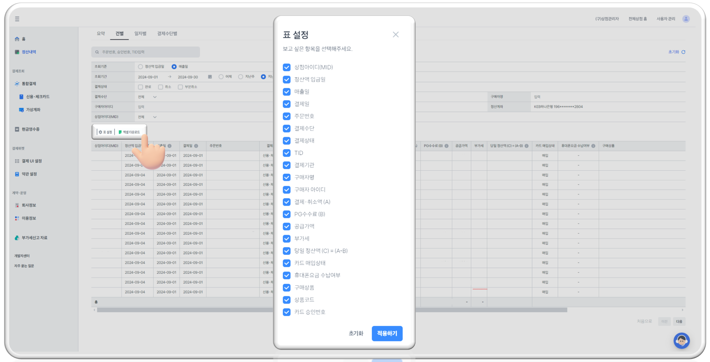 표 설정을 통해 보고 싶은 항목을 선택하실 수 있고, 엑셀 및 pdf 다운로드도 가능해요. 원하시는 항목을 선택하신 후 적용하기를 눌러주세요.
