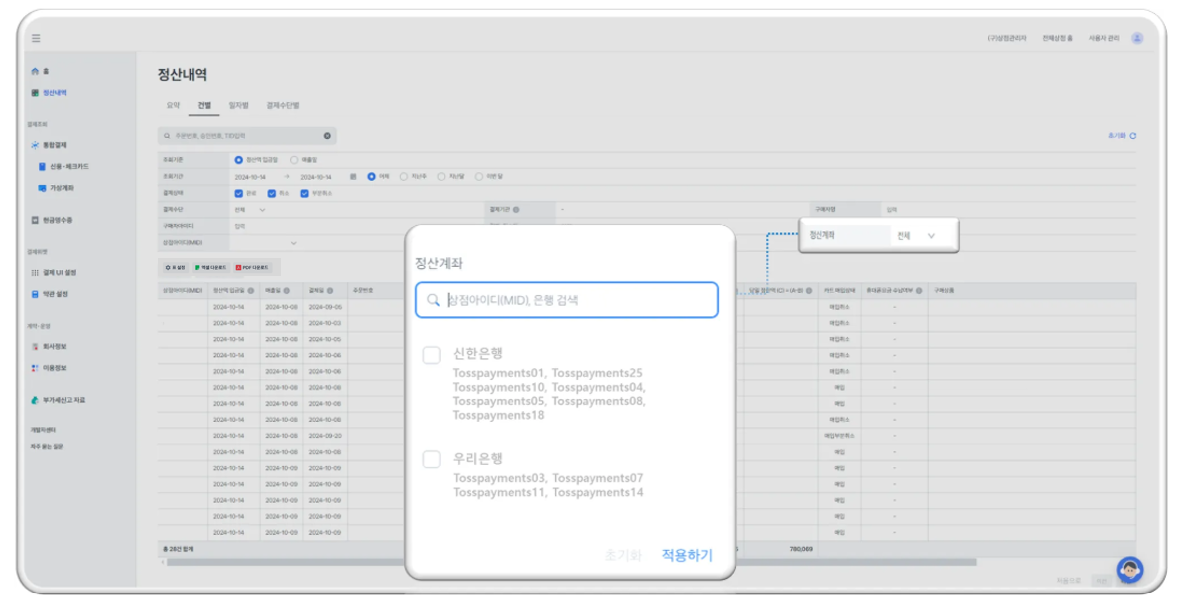 정산계좌별로 조회 시 해당 은행과 상점아이디로 검색이 가능해요.