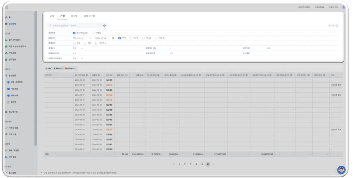 상점관리자 정산내역 건별 탭으로 접속하시면 아래와 같이 다양한 항목으로 조회가 가능해요.