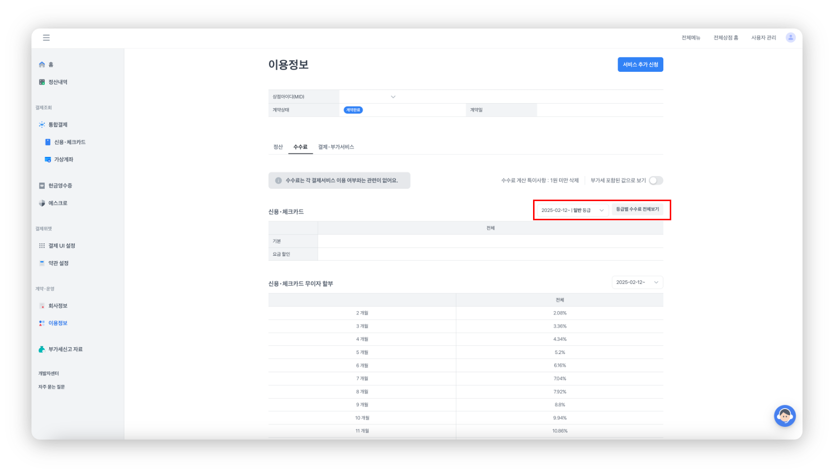 영중소 등급 현황은 상점관리자 상의 이용정보 탭 > MID 선택 > 수수료 탭을 선택하면 현재 적용 중인 영중소 등급을 통해 확인할 수 있어요.
