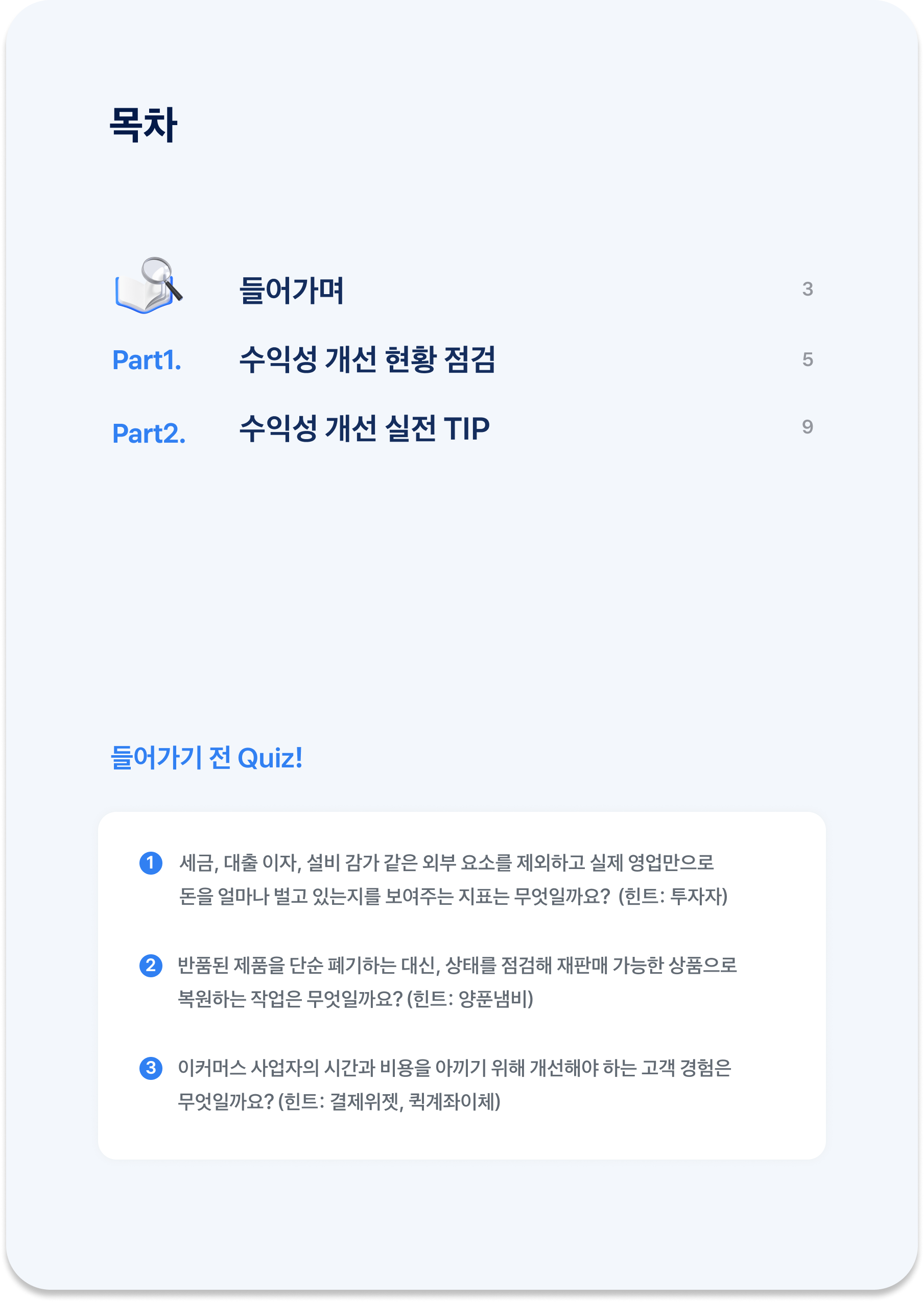 본 리포트에선 이커머스 비즈니스를 운영하면서 당면하는 다양한 고정비와 변동비, 그리고 고객 획득 및 유지 전략 속에서 보다 실질적인 수익을 확보할 수 있는 방법들을 항목별로 안내드리고자 합니다. 리포트를 통해 이커머스 운영의 구조를 매출 중심에서 이익 중심으로 전환하실 수 있기를 바랍니다.