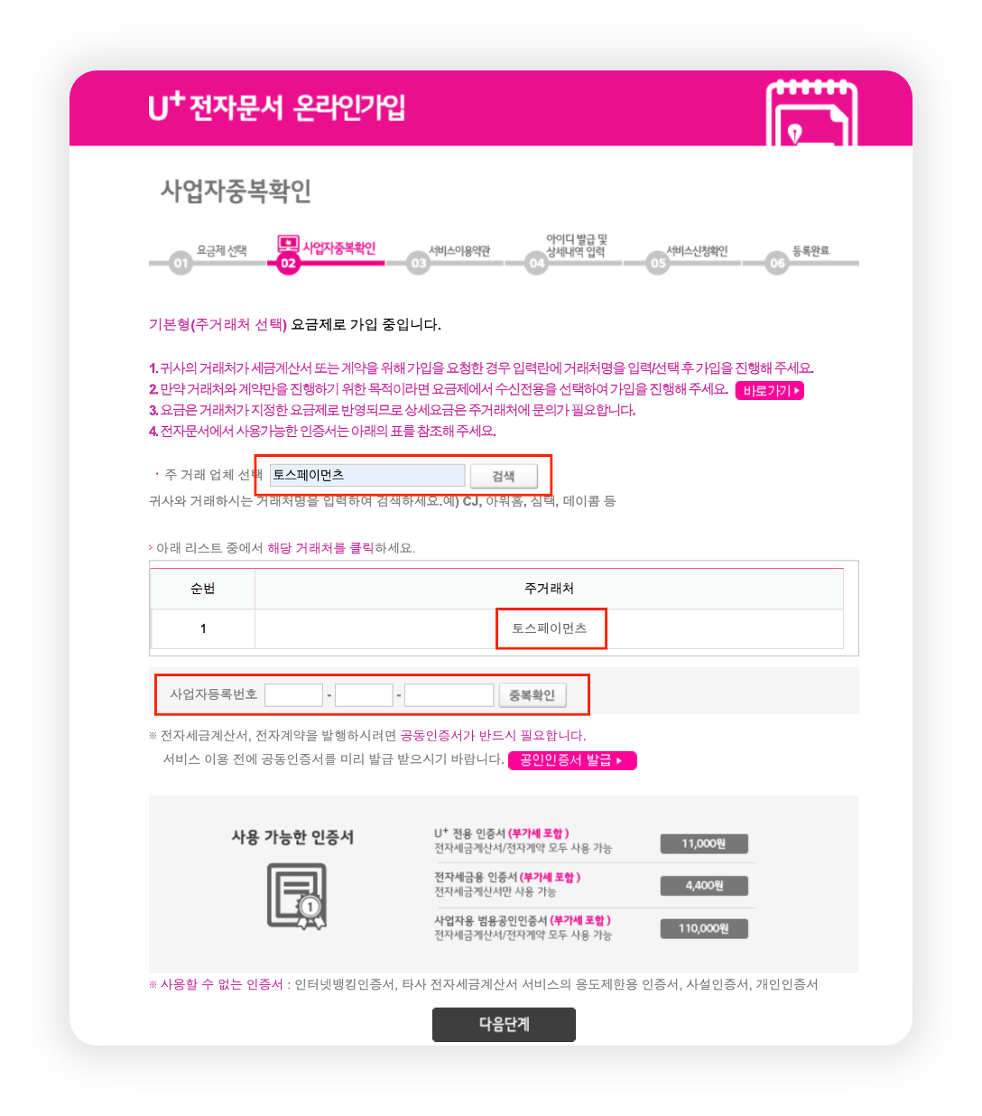 네. 주 거래처를 토스페이먼츠로 선택해 가입하셔야 지정된 요금제가 적용되고, 전자서명이 가능해요.