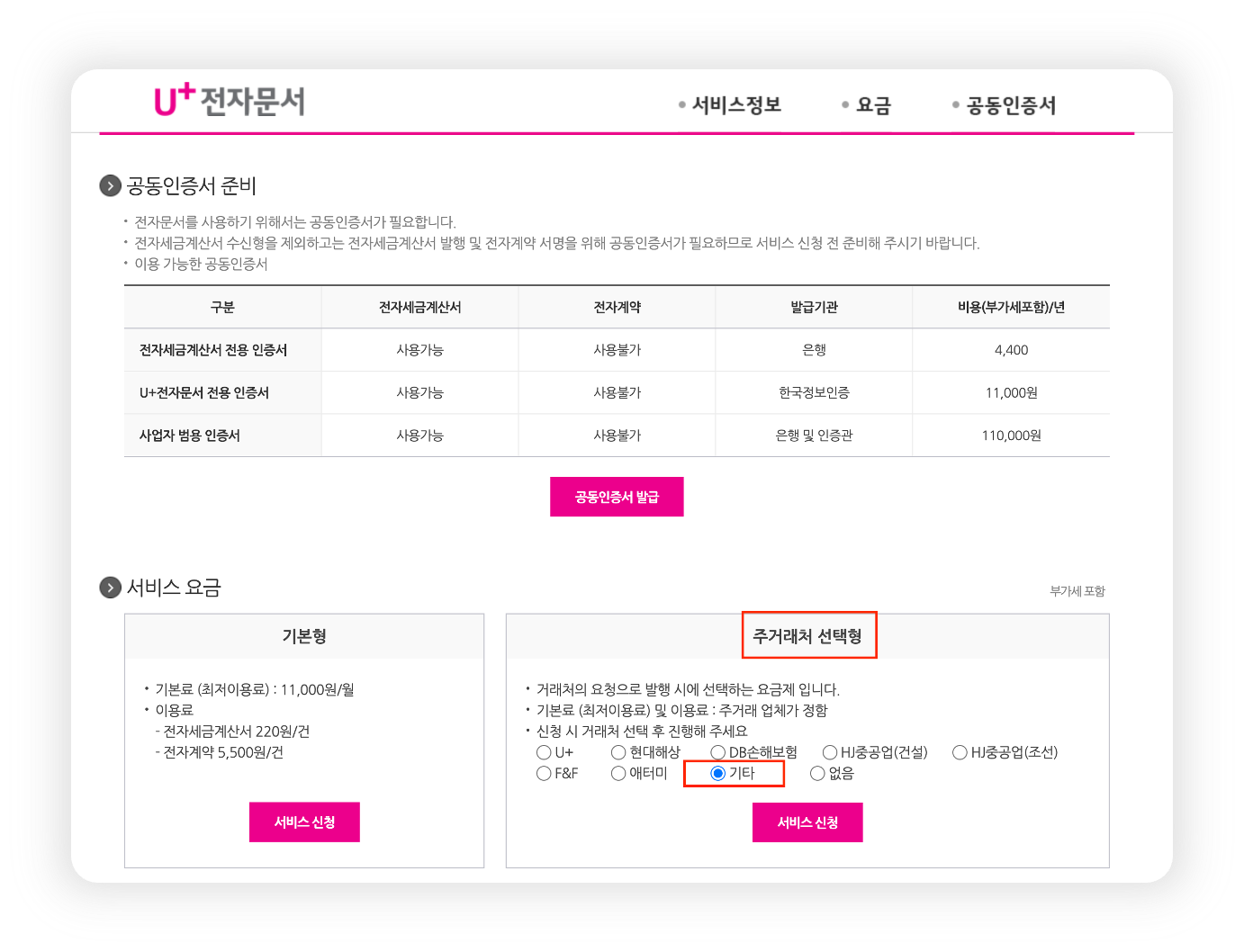 주거래처 선택형에서 [기타]를 선택한 후 서비스 신청을 클릭해주세요.