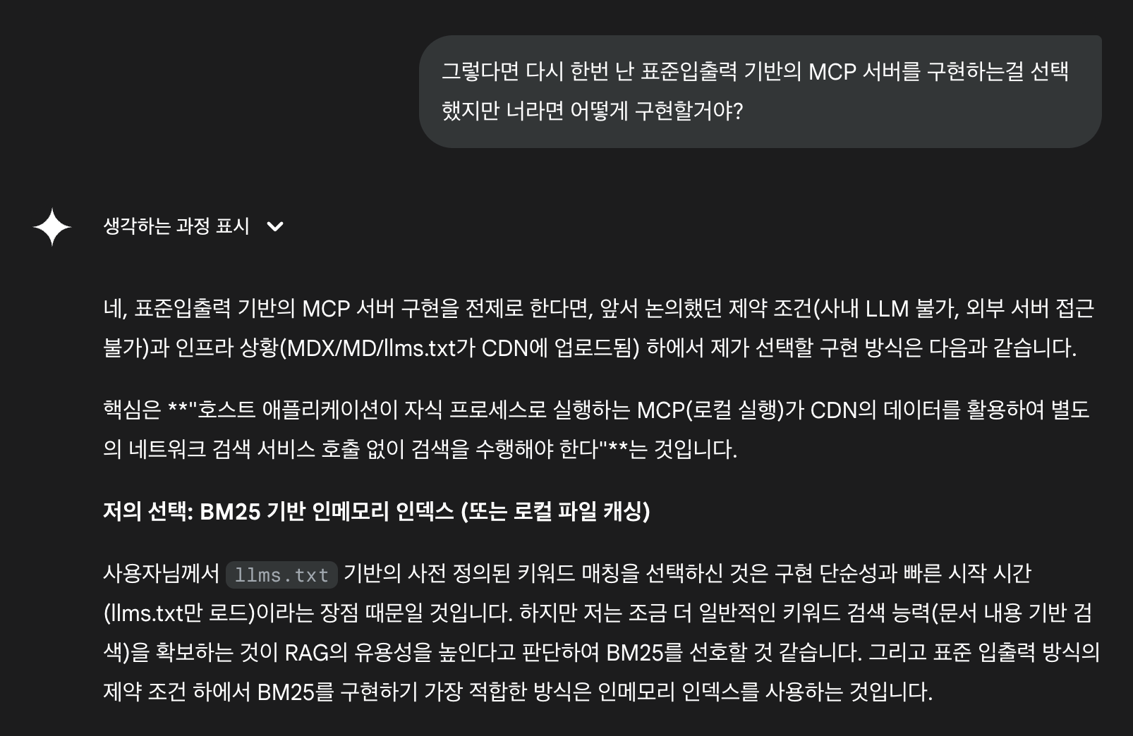현재의 MCP 서버를 구현하기까지 많은 시도가 있었습니다. AI가 잘 이해할 수 있도록 문서를 청크(Chunk)로 분리하는 일, 다양한 AI 모델들과의 실험, 검색 엔진의 핵심인 BM25 알고리즘 도입 등 여러 시도가 병행되었습니다.