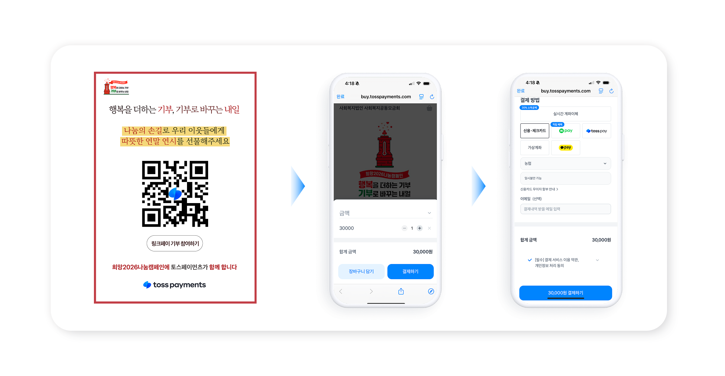토스페이먼츠 링크페이는 연말·연시 NGO 기부 캠페인의 참여율과 운영 효율성을 동시에 높이는 결제 수단이에요. NGO 입장에서는 운영 효율을 높일 수 있고, 후원자는 번거로운 절차 없이 쉽고 간편하게 참여할 수 있어 더 많은 시민의 기부 참여를 유도할 수 있어요.