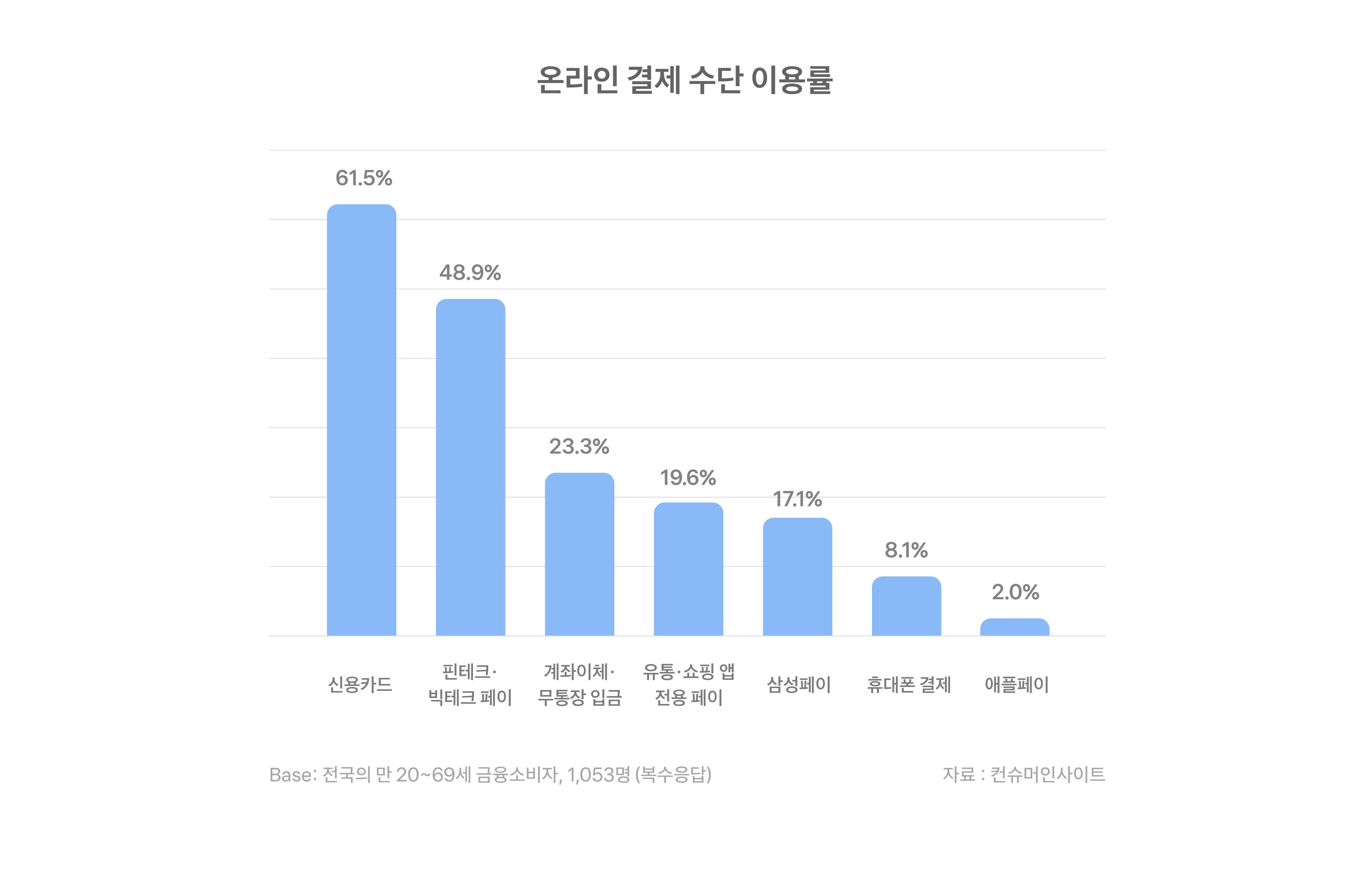 온라인 결제 수단 이용률(복수응답) 통계에 따르면 신용카드가 61.5%로 가장 높았고, 이어 핀테크·빅테크 페이(48.9%), 계좌이체·무통장 입금(23.3%), 유통·쇼핑 앱 전용 페이(19.6%), 삼성페이(17.1%), 휴대폰 결제(8.1%), 애플페이(2.0%)가 차례로 뒤를 이어요.