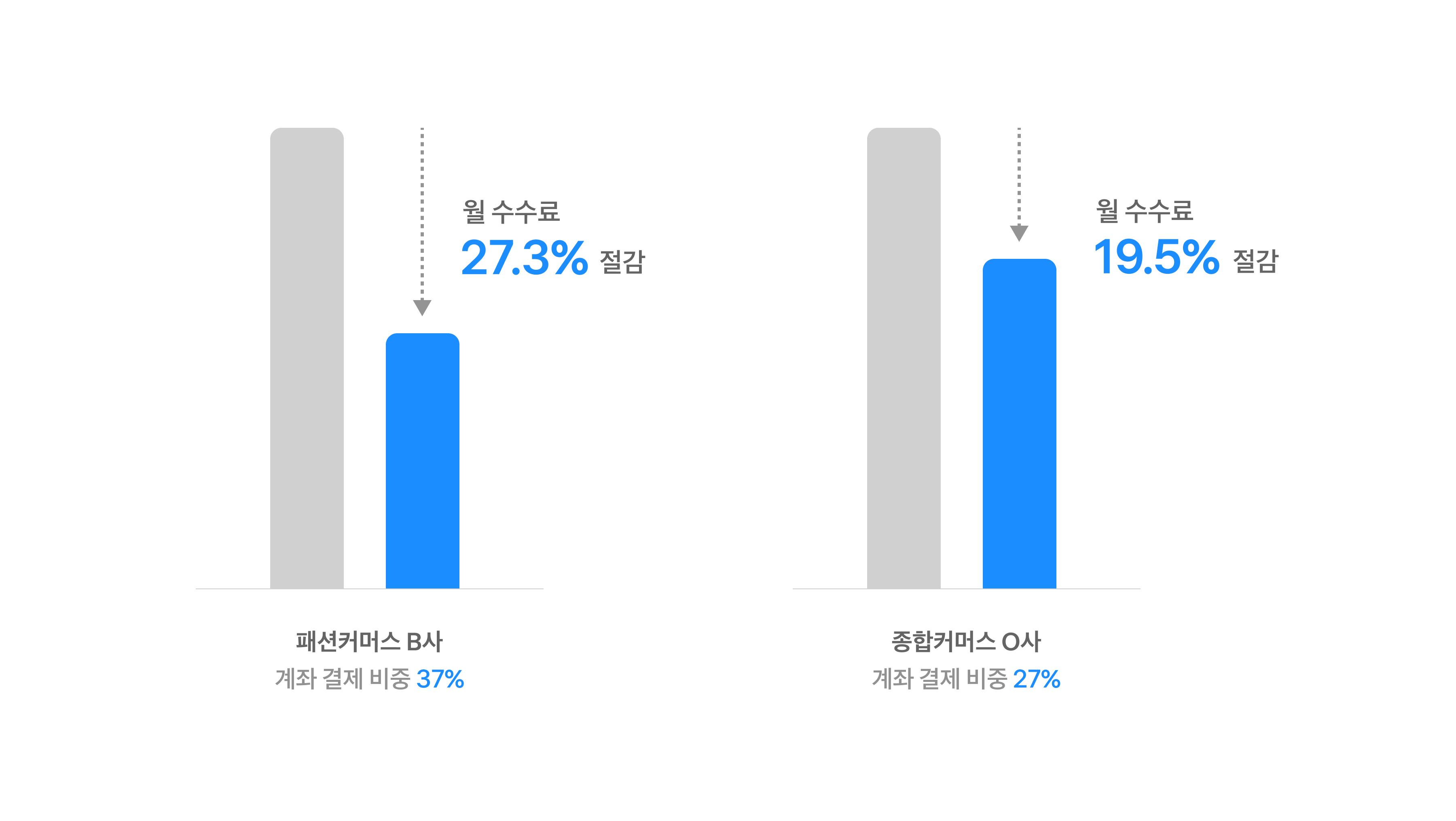 이커머스 쇼핑몰은 물론이고 최근 교육·콘텐츠·여행 등 각종 플랫폼 업종에서까지 퀵계좌이체를 통해 수수료를 절감하고 있는데요. 패션커머스 B사의 경우 계좌결제 비중을 37%로 늘리고 월 수수료를 27.3% 절감해 11개월 동안 약 1.6억 원의 수수료를 아꼈고, 종합 커머스 O사의 경우도 계좌결제 비중을 27%로 늘리고 월 수수료를 19.5% 절감했어요.