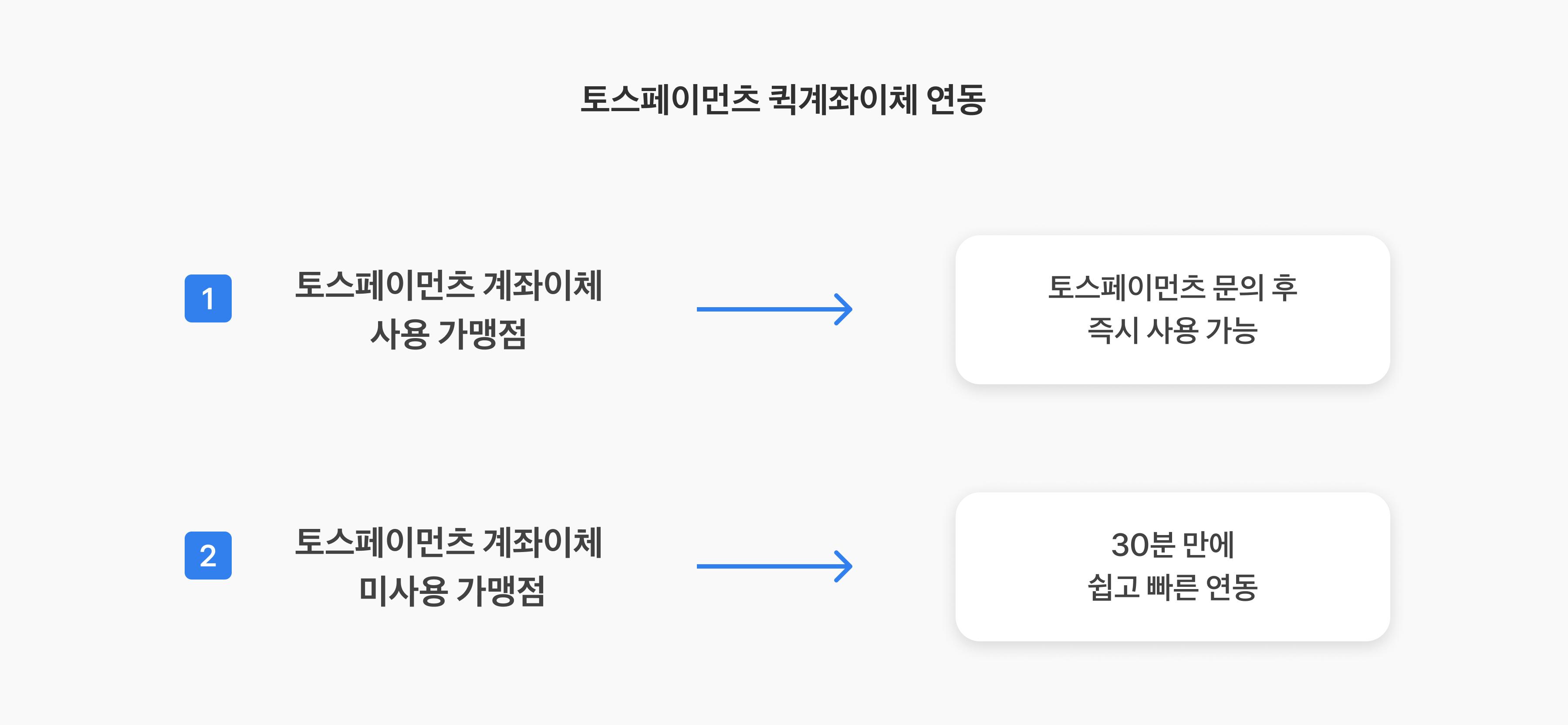 토스페이먼츠 계좌이체 서비스 사용 여부에 따라 기존 토스페이먼츠 계좌이체 사용 가맹점이라면 토스페이먼츠 문의 후 즉시 사용 가능하고, 기존 토스페이먼츠 고객이긴 하나 계좌이체는 미사용 중인 가맹점이라면 30분 안에 쉽고 빠르게 연동한 후 바로 사용할 수 있어요.