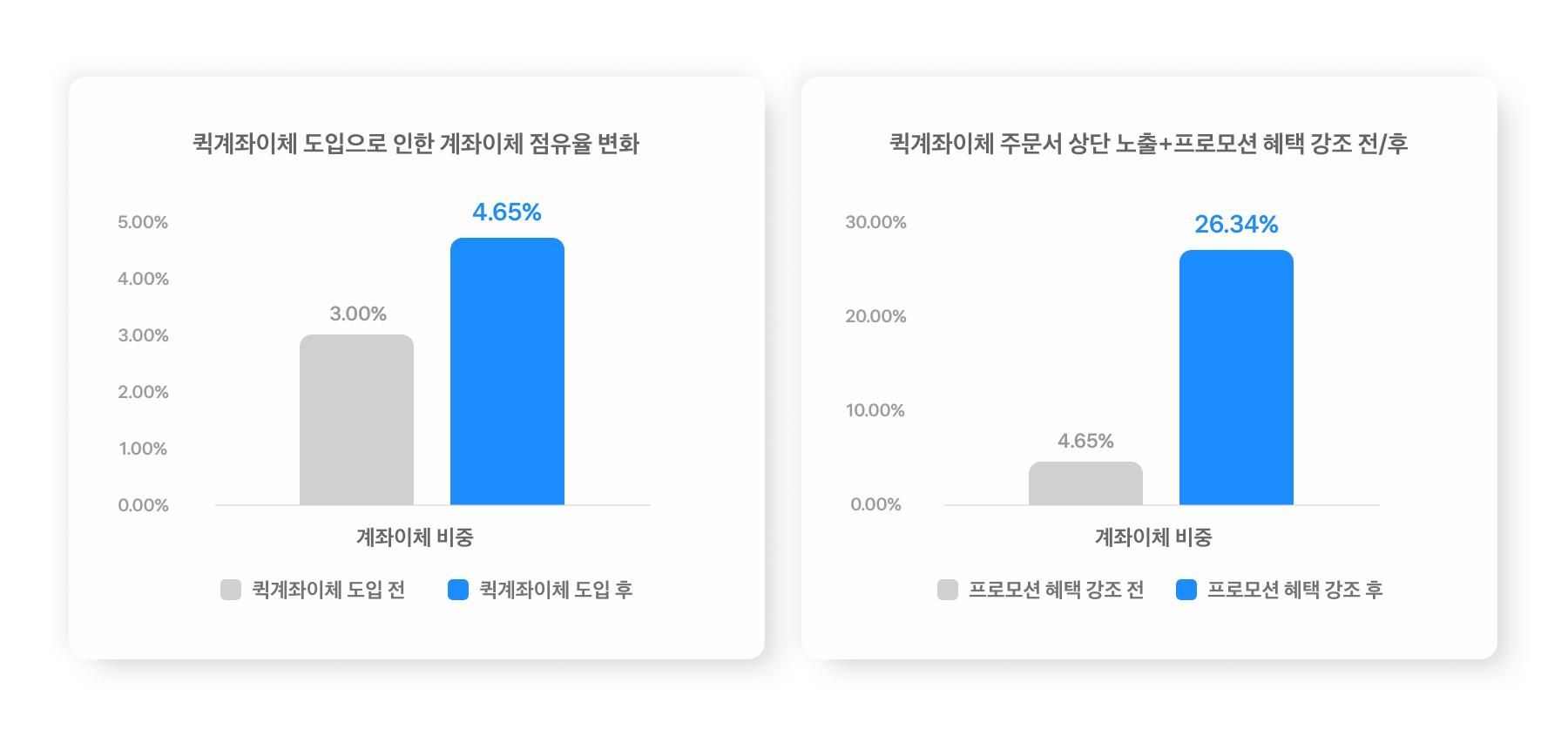실제로 퀵계좌이체 도입만으로도 계좌이체 점유율이 3%대에서 4.6%대로 올라갔으며, 퀵계좌이체를 결제창 상단에 노출하고 프로모션 혜택을 강조했을 때는 점유율이 무려 4%에서 26%까지 드라마틱하게 상승한 사례도 있었어요.
