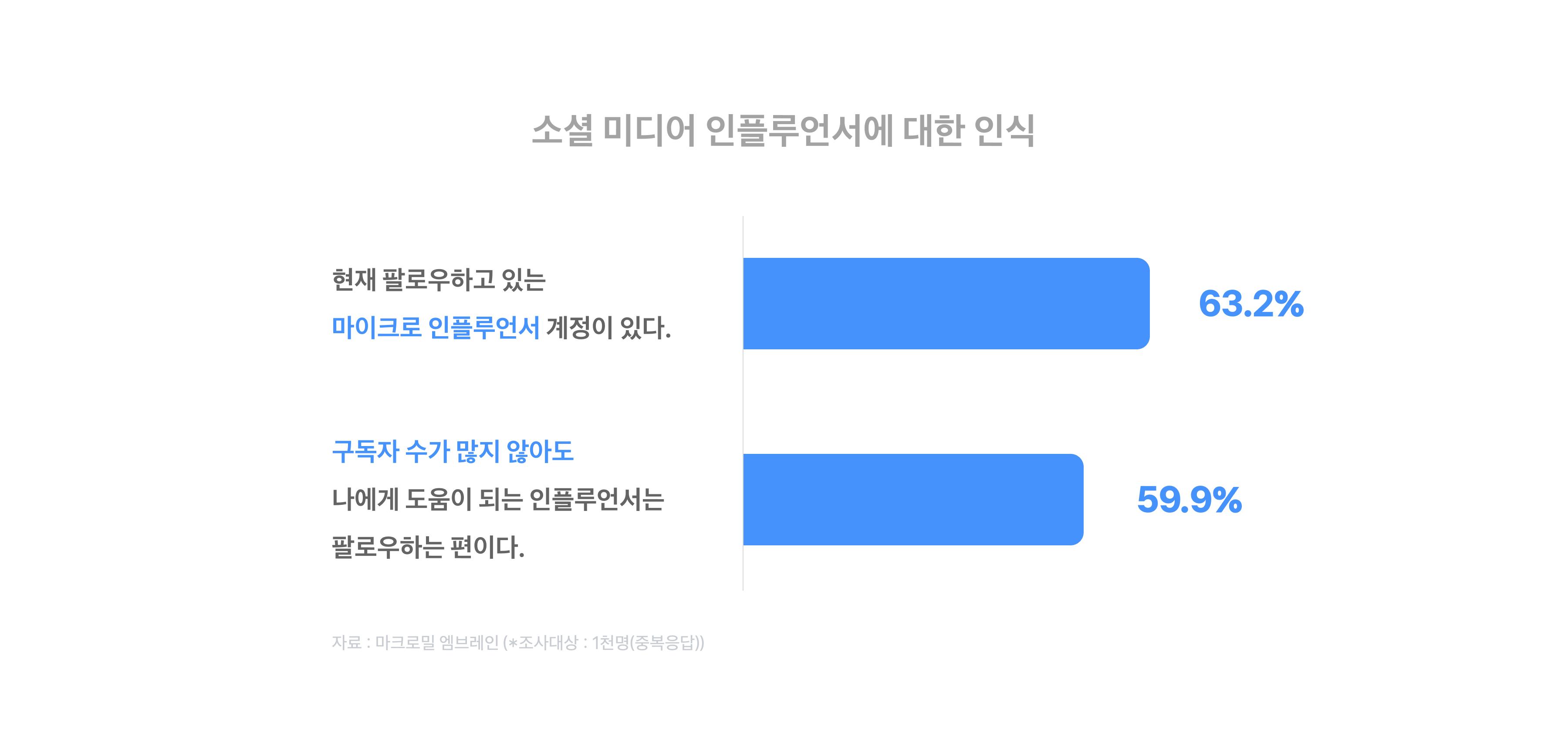 소셜 미디어 인플루언서에 대한 인식을 묻는 설문조사도 흥미로워요. ‘어떤 인플루언서의 현재 구독자 수가 많지 않다고 하더라도 나에게 도움이 되는 정보를 준다면 팔로우할 것이다’라고 응답한 사람이 약 60%에 달해요.