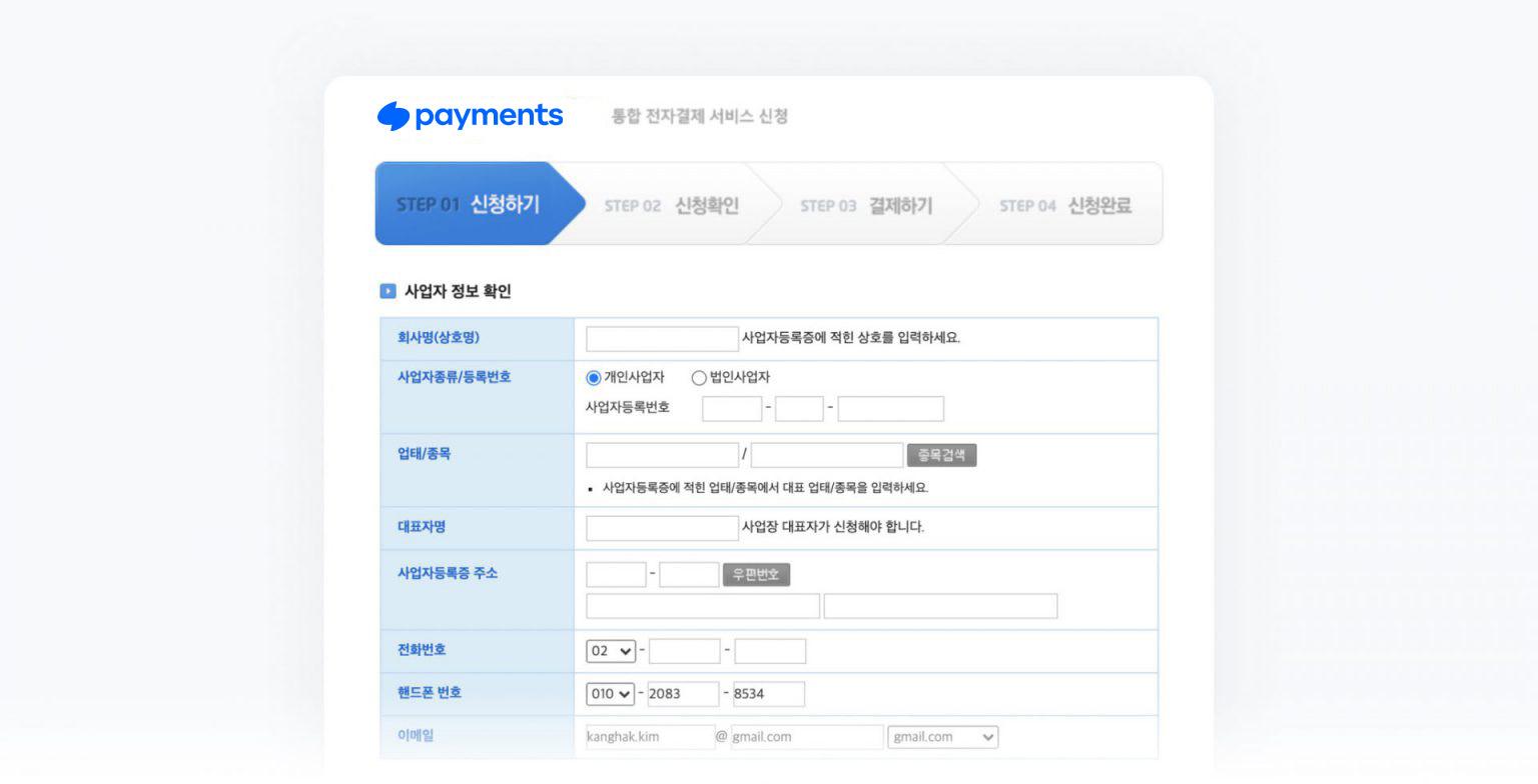 ② 통합 전자결제서비스 신청 호스팅사에서 요구하는 사업자 정보를 입력하고 몇 가지 절차를 마치면 서비스 신청이 ‘완료’됐다는 메시지를 받게 됩니다. 많은 사용자들이 이 단계에서 정상적으로 전자결제서비스 신청을 마쳤다고 생각합니다.