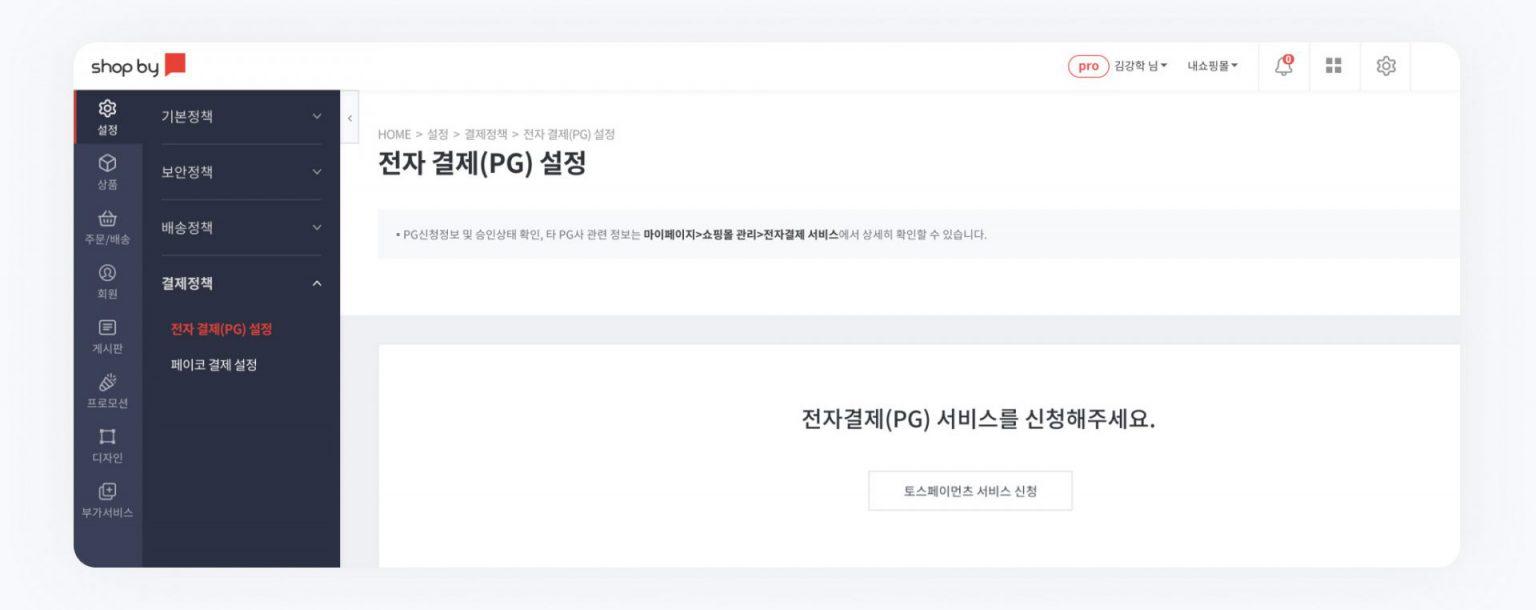 ① 전자결제서비스 신청 안내 호스팅사에서 홈페이지 제작을 끝내면 전자결제서비스를 제공하는 PG사에 가입하라는 안내를 받게 됩니다. 아래 화면에서 ‘토스페이먼츠 서비스 신청’ 버튼을 누르면 전자결제서비스 신청 단계가 시작됩니다.