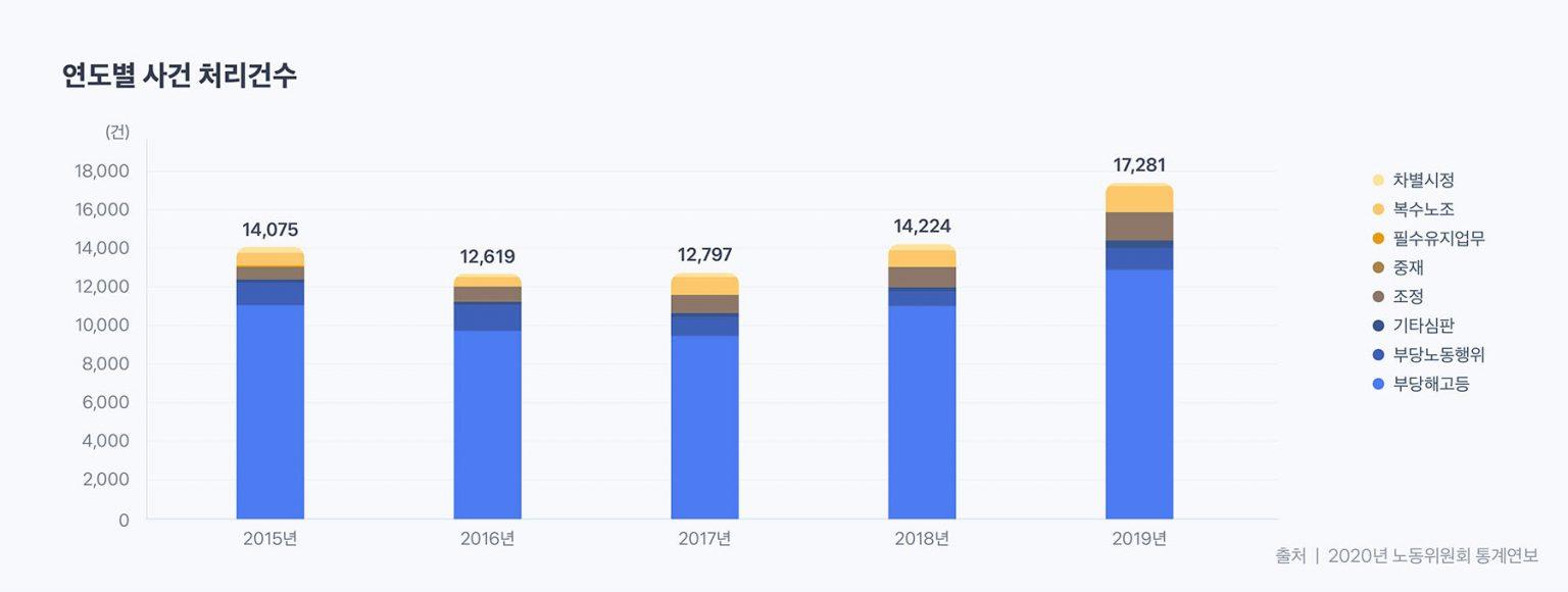 위 표를 통해 2019년 노동위원회에 접수된 사건 구성을 살펴보면 1만 7천 건의 신고 중 ‘부당해고’ 관련 신고가 무료 76%(약 1만3천 건)에 차지한다는 것을 알 수 있습니다.